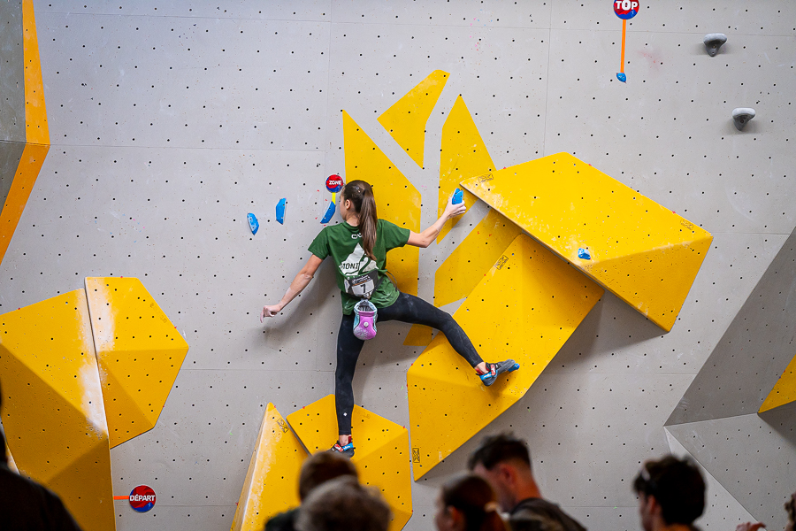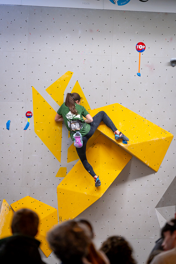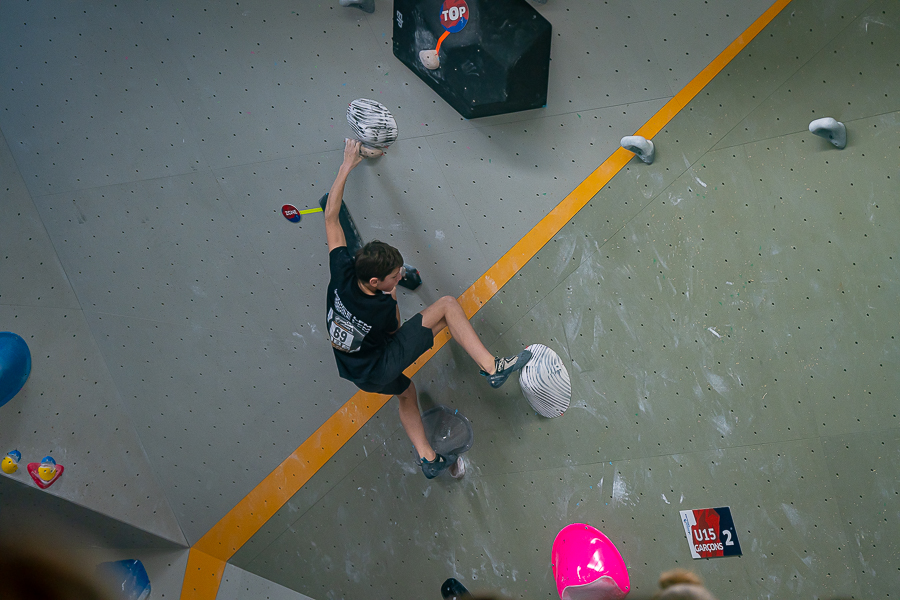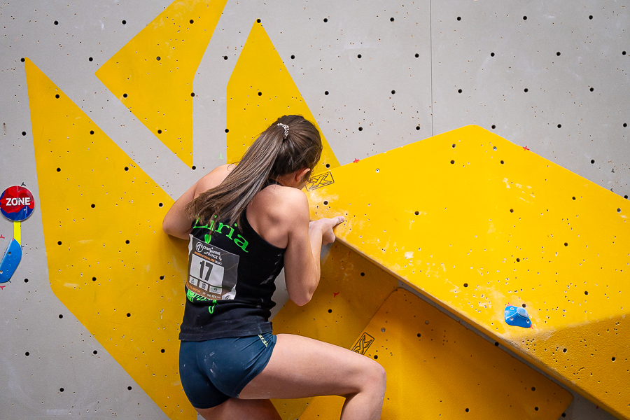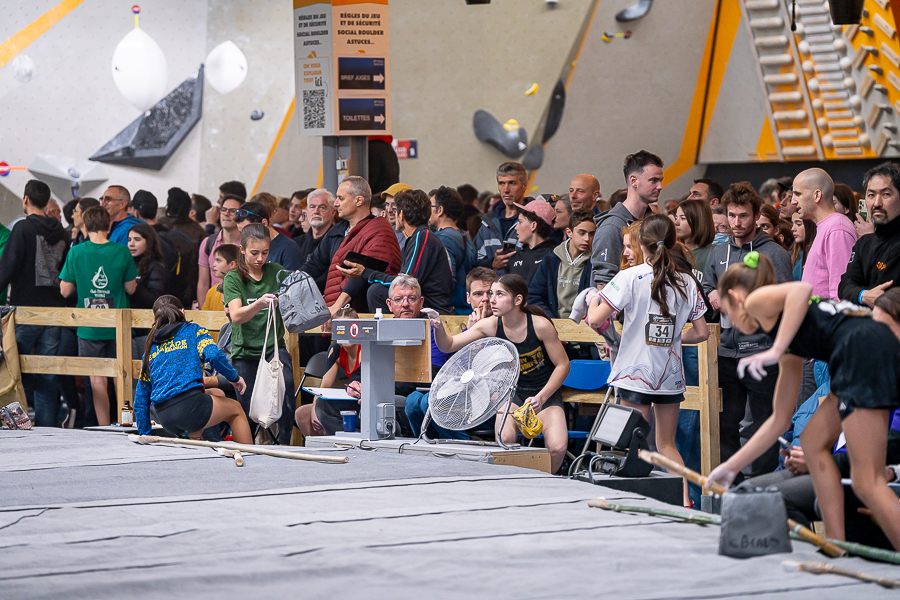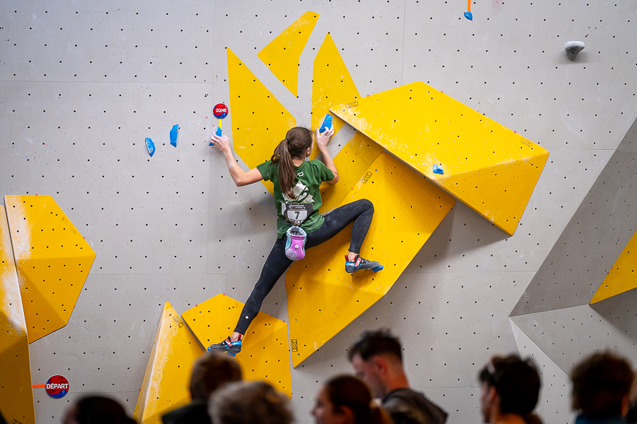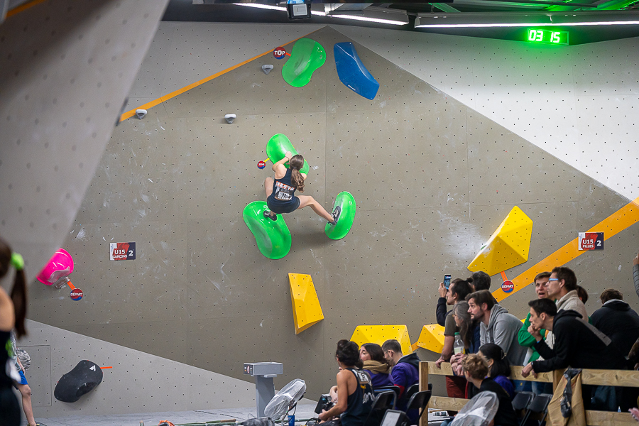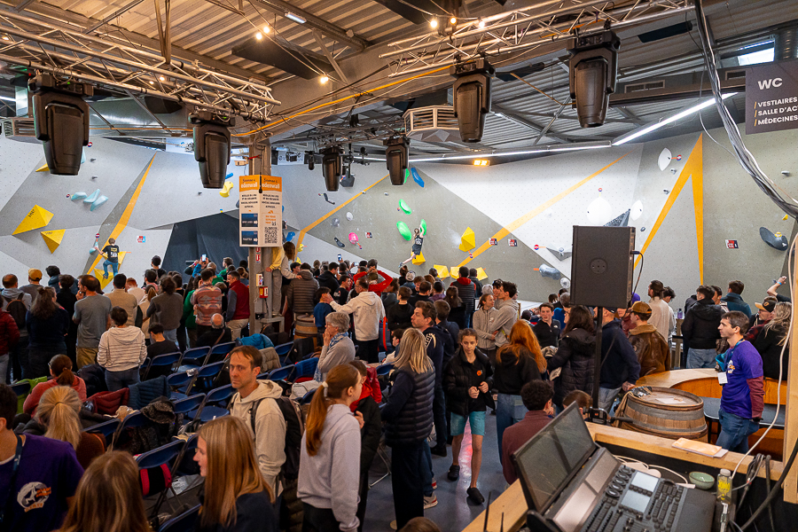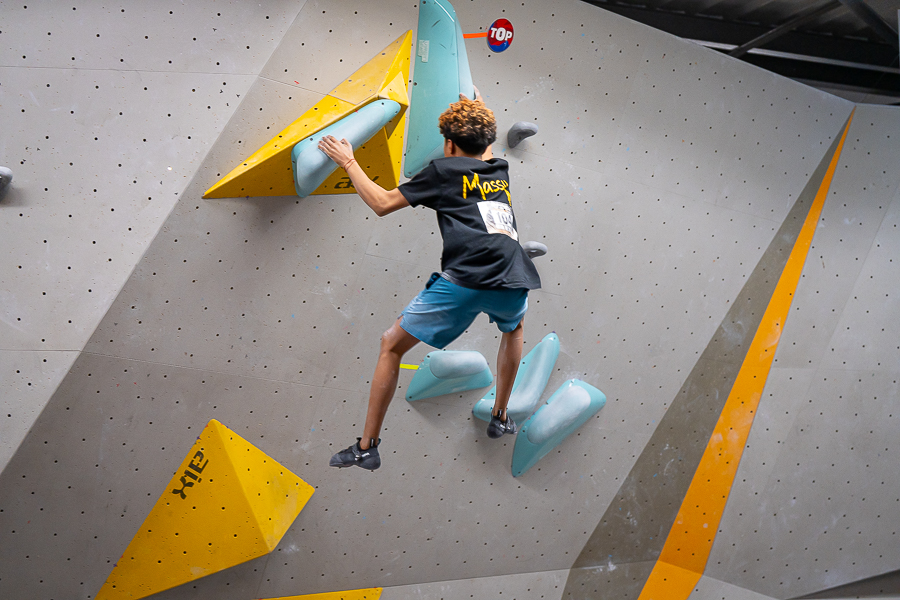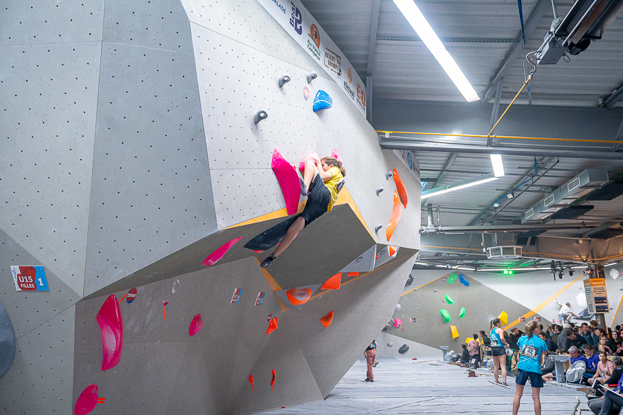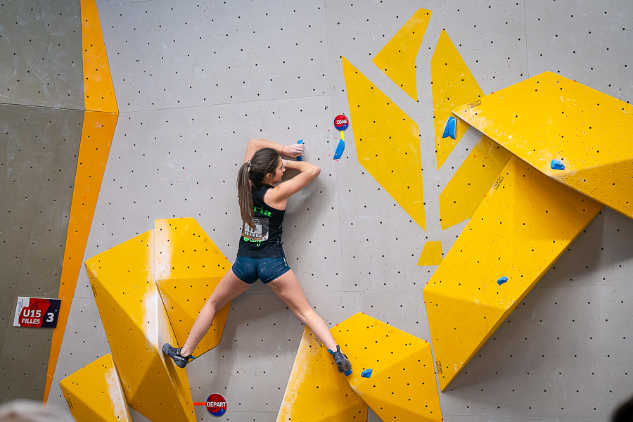 « Il y a environ une cinquantaine de jeunes par catégorie » nous indique Emmanuelle Vallesi, avant de poursuivre « tous les jeunes sélectionnés pour ce championnat de France ce weekend ont déjà passé plusieurs étapes au niveau régional et national. Pour déterminer le champion de France, les jeunes grimpeurs se départagent au cours de qualifications sur 6 blocs. 1 bloc est un parcours d’escalade et chaque participant a 4 minutes pour le lire, le comprendre et enfin essayer de le gravir. Selon la difficulté, il y a des zones intermédiaires à atteindre qui peuvent leur rapporter des points. À l’issue des ces 6 blocs, 8 grimpeurs sont qualifiés pour les finales. Les grandes finales, à partir de 20h ce samedi soir, étaient impressionnantes avec son et lumière, une ambiance de folie et une retransmission en direct sur Youtube ».