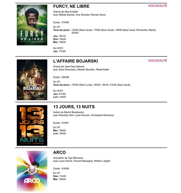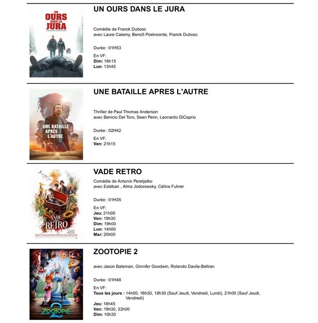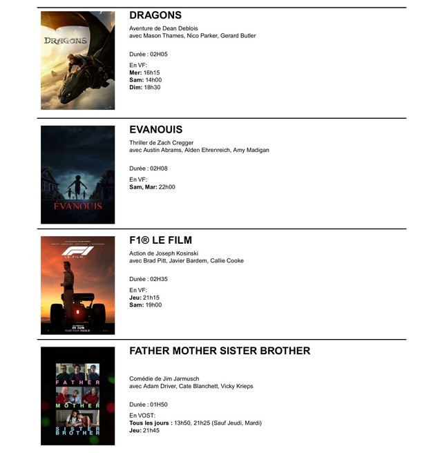 du 14 au 20 janvier 2026 : DRAGONS / ARCO / LILO & STITCH / F1® LE FILM / LIFE OF CHUCK / UNE BATAILLE APRES L'AUTRE / SINNERS / EVANOUIS / 13 JOURS, 13 NUITS / DOSSIER 137 / UN OURS DANS LE JURA / L’ATTACHEMENT / LA VENUE DE L'AVENIR / MA MERE, DIEU ET SYLVIE VARTAN / PARTIR UN JOUR