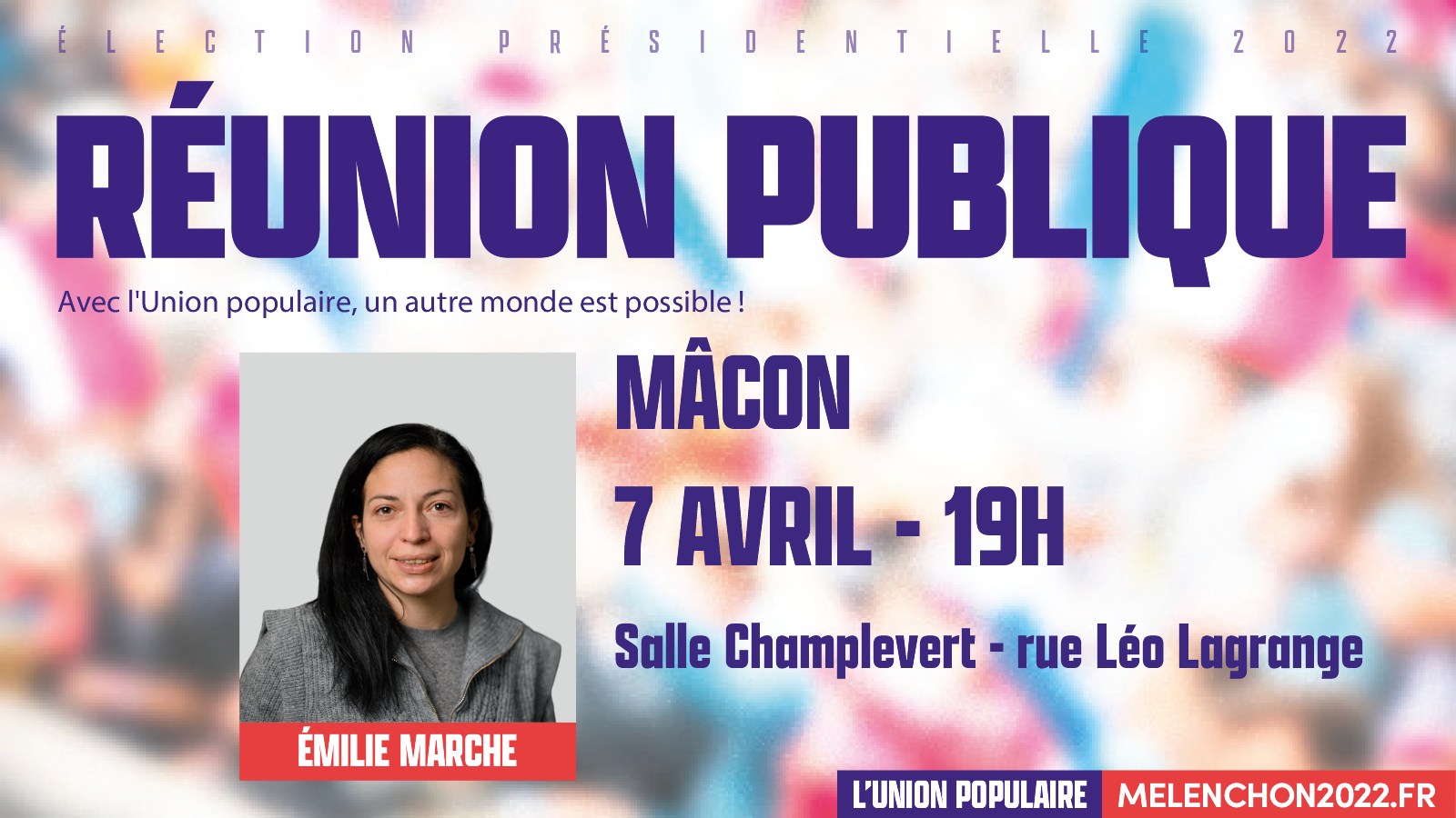 C’est pourquoi, à 3 jours de l’échéance présidentielle, les militants locaux de l’Union Populaire invitent les habitants de Mâcon et ses alentours à une réunion publique le jeudi 7 avril à 19h, salle Champlevert, rue Léo Lagrange à Mâcon en présence d’Émilie Marche, Conseillère régionale insoumise en Auvergne-Rhône-Alpes et membre du parlement de l’Union Populaire. Elle axera son intervention plus particulièrement sur l’industrie et les transports et pourra répondre aux questions que se posent les électeurs sur notre programme.