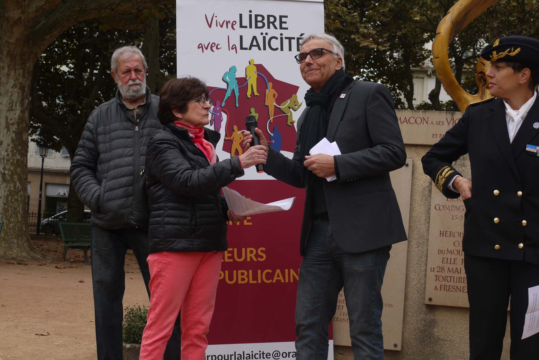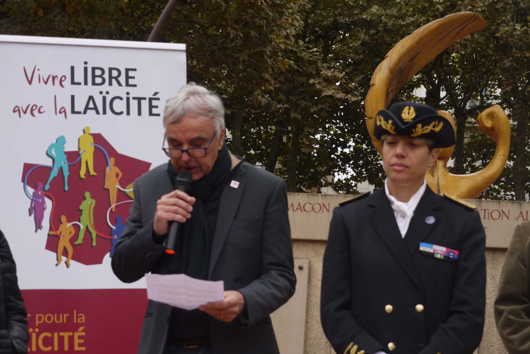 Cette cérémonie s’inscrivait en amont de la diffusion d’un film sur Samuel Pathy à la MJC Héritan le 20 novembre à 18h, d’une intervention sur la laïcité à Mâcon le 27 novembre et enfin du spectacle « Vivre libre » de la compagnie Le Pendart, qui se tiendra à Vonnas le 9 décembre. Non sans rappeler les faits des deux assassinats survenus en 2020 et 2023, les discours se succèdent, appuyant sur l’importance de la laïcité et de la liberté d’expression, au cœur de ces deux drames.