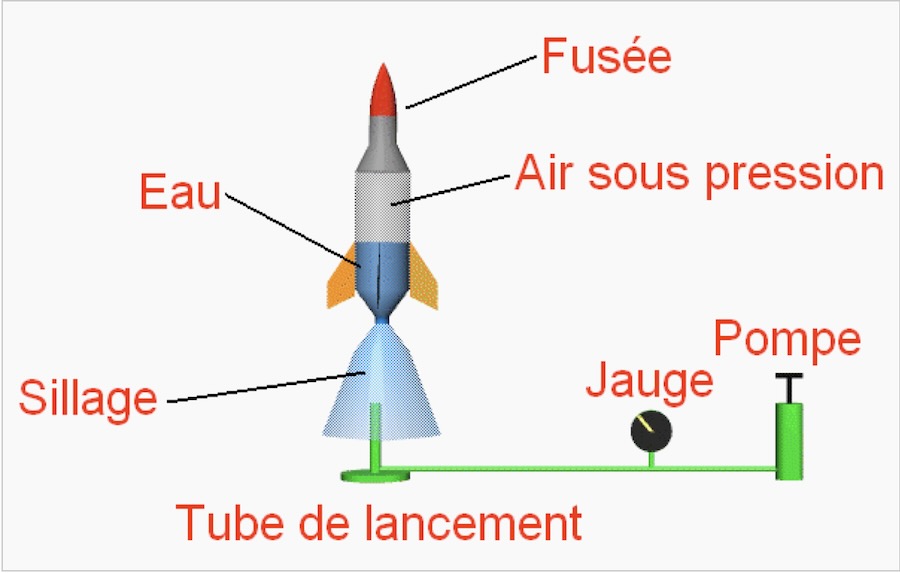 « Après avoir rempli le réservoir d’un tiers d’eau, il s’agit d’insérer le bouchon et de mettre la fusée sur sa rampe. Il ne reste plus qu’à pomper jusqu’à ce que la pression à l’intérieur de la bouteille devienne suffisante pour faire partir le bouchon : la pression est telle que le bouchon est éjecté avec la masse d’eau contenue dans la bouteille. Le manomètre de la pompe permet de se rendre compte de la pression dans la bouteille : les 5 bars sont atteints sans difficulté. »
