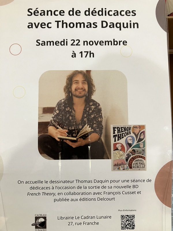 Ce samedi 22 novembre au cœur de Mâcon, Marcelo de Souza Barbosa récent propriétaire de la librairie indépendante « Le Cadran Lunaire « a reçu Thomas DAQUIN jeune auteur de BD dont le talent commence à faire parler de lui.