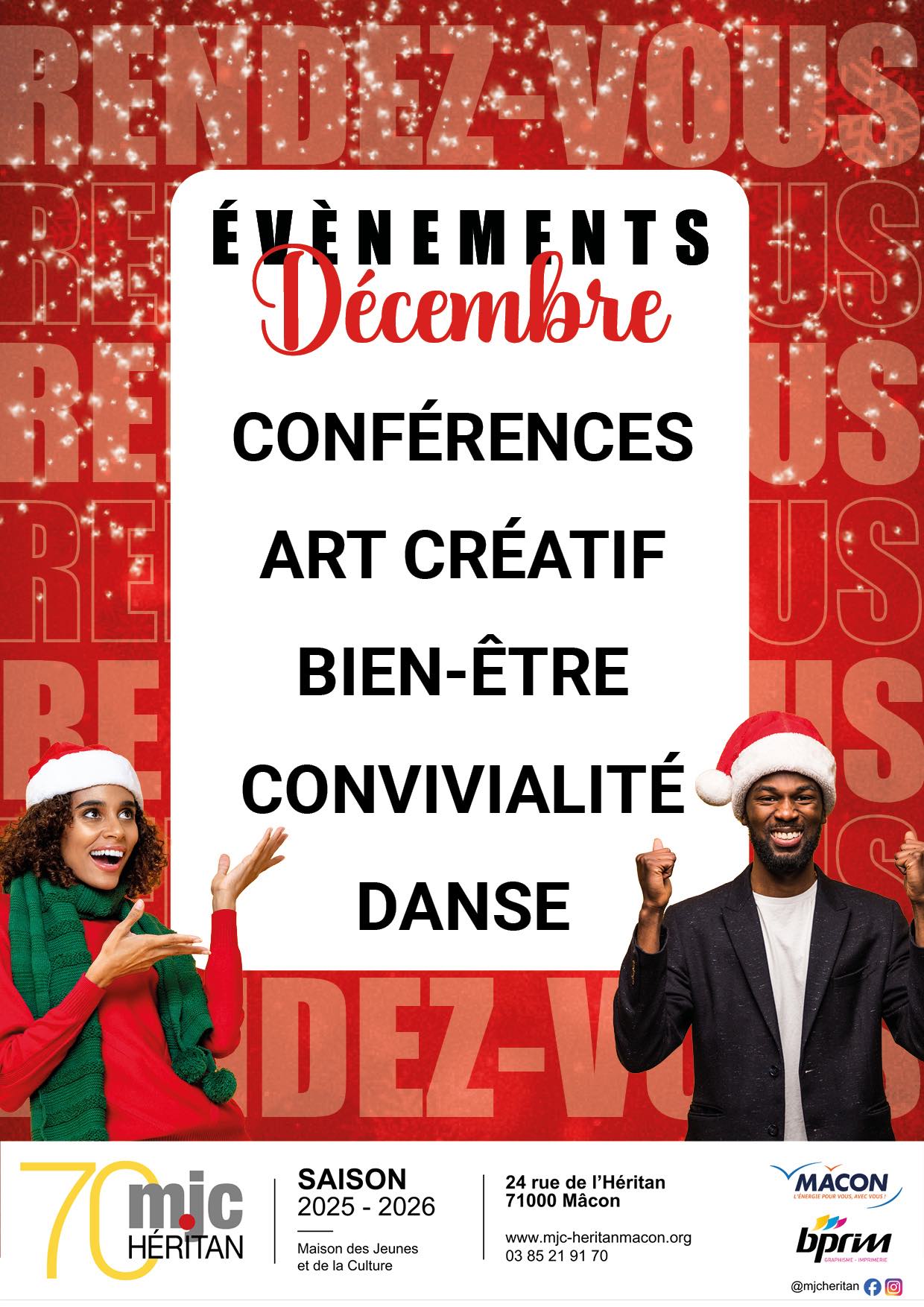 Conférences ; yoga de l'énergie ; auto-coaching ; Parent & Bambin, à vous de jouer ; fabriquer une couronne de Noël etc. Découvrez vite le programme de décembre ici-même. 1er rendez-vous dès mardi