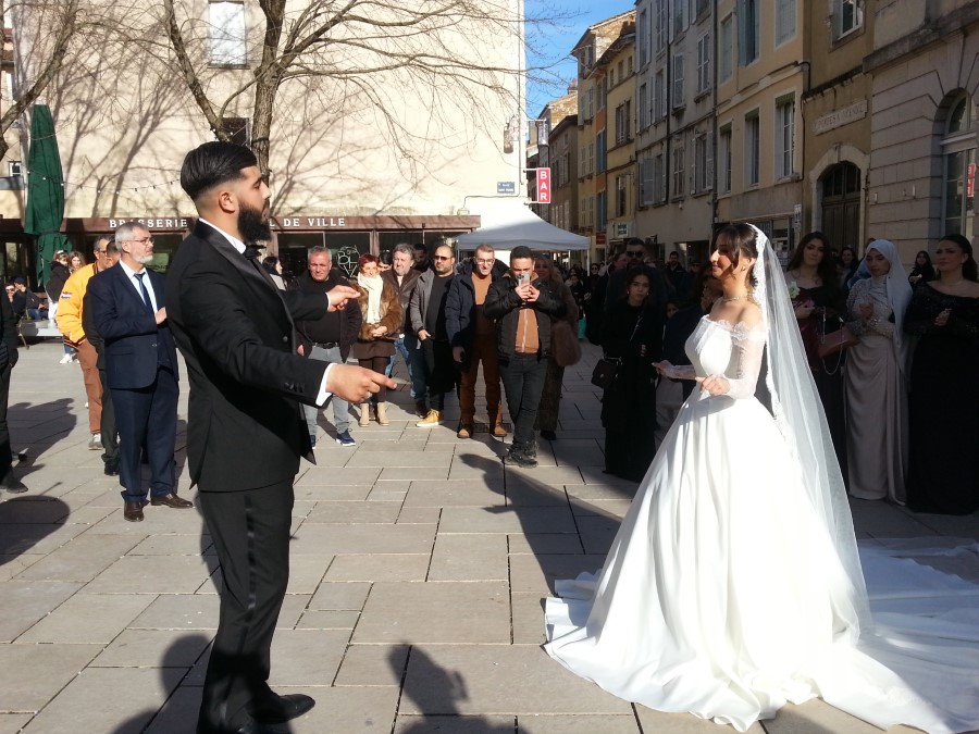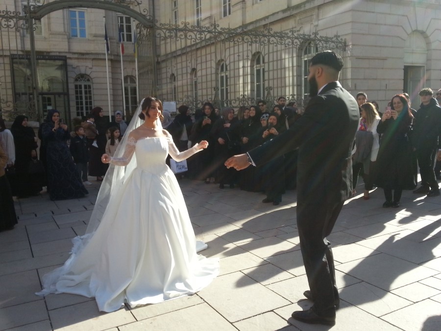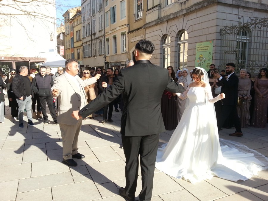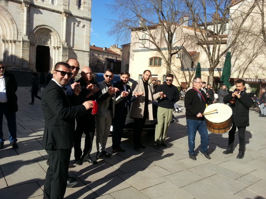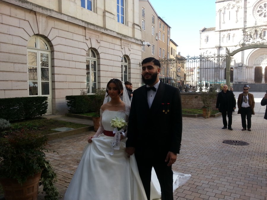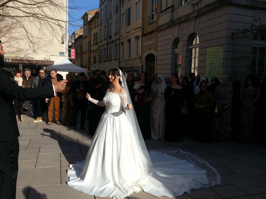 Les futurs mariés sont arrivés dans une grande voiture blanche et toute la place Saint-Pierre a résonné d'une belle musique traditionnelle (clarinette et percussions) qui a accompagné l'entrée et la sortie des jeunes mariés. Des danses entre convives se sont produites spontanément devant la mairie. La cérémonie se poursuivra en plus petit comité dans les environs de Lyon.