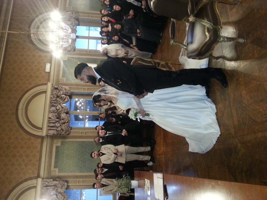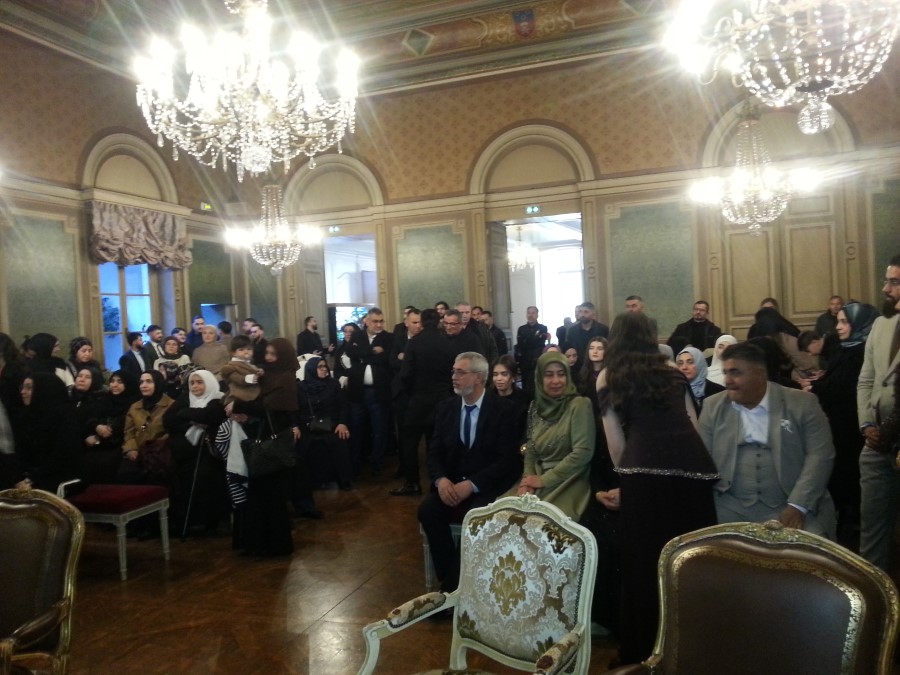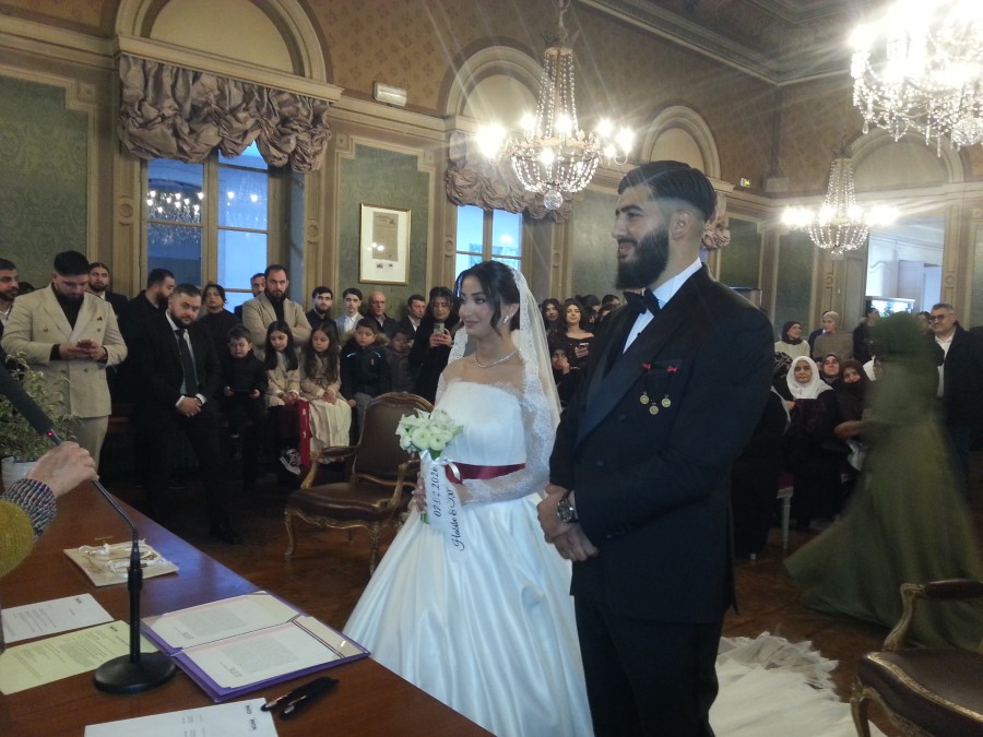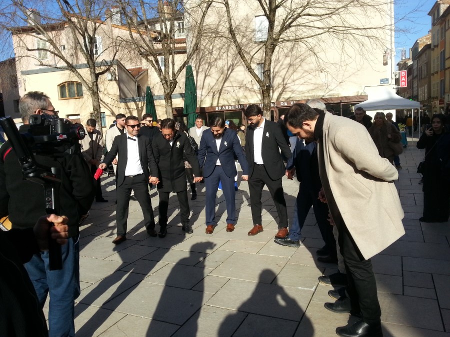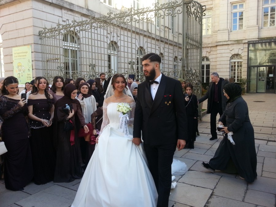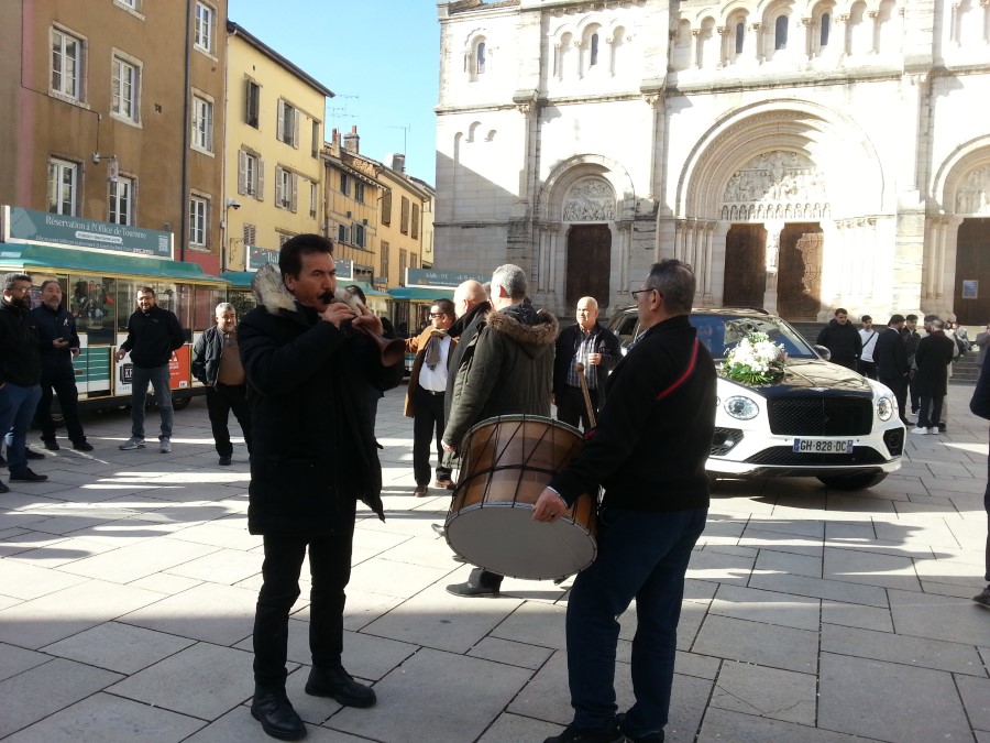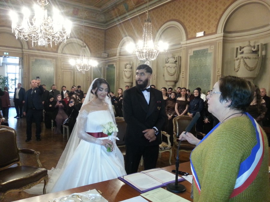 Les futurs mariés sont arrivés dans une grande voiture blanche et toute la place Saint-Pierre a résonné d'une belle musique traditionnelle (clarinette et percussions) qui a accompagné l'entrée et la sortie des jeunes mariés. Des danses entre convives se sont produites spontanément devant la mairie. La cérémonie se poursuivra en plus petit comité dans les environs de Lyon.