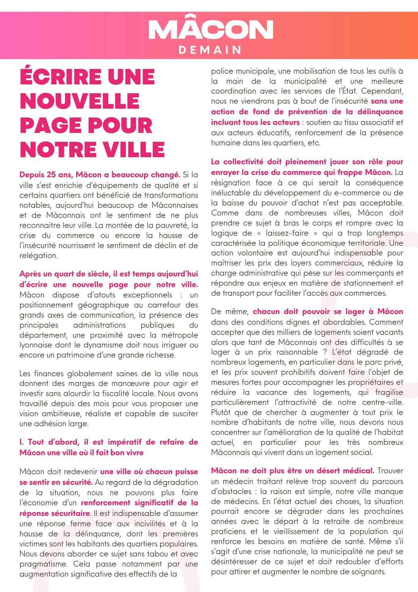 Au cours de sa déclaration à la presse, il n’a pas donné dans l’attaque frontale contre le maire de Mâcon et a fait part de sa volonté « d’écrire une nouvelle page ». Ceci dit, il ne tourne pas autour du pot et dresse les urgences à traiter pour « une ville que ses habitants ne reconnaissent plus » affirme-t’il. « Mais il n’y a pas de fatalité. Nous avons défini 5 urgence pour écrire cette nouvelle page : d’abord s’attaquer à l'insécurité, « Il nous faut prendre ce sujet à bras le corps et arrêter avec les pudeurs de gazelles. Ensuite, traiter la crise du commerce de centre-ville. En trois, le logement, avec un sujet, celui du parc privé. Quatre, la santé. Mâcon est un désert médical ! Enfin, s’attaquer sérieusement à la crise écologique. » Après cette énumération des priorités, le désormais candidat a évoqué trois impensés de la majorité actuelle : la vie universitaire, le potentiel touristique de la ville et la frontière administrative qui bride le développement.