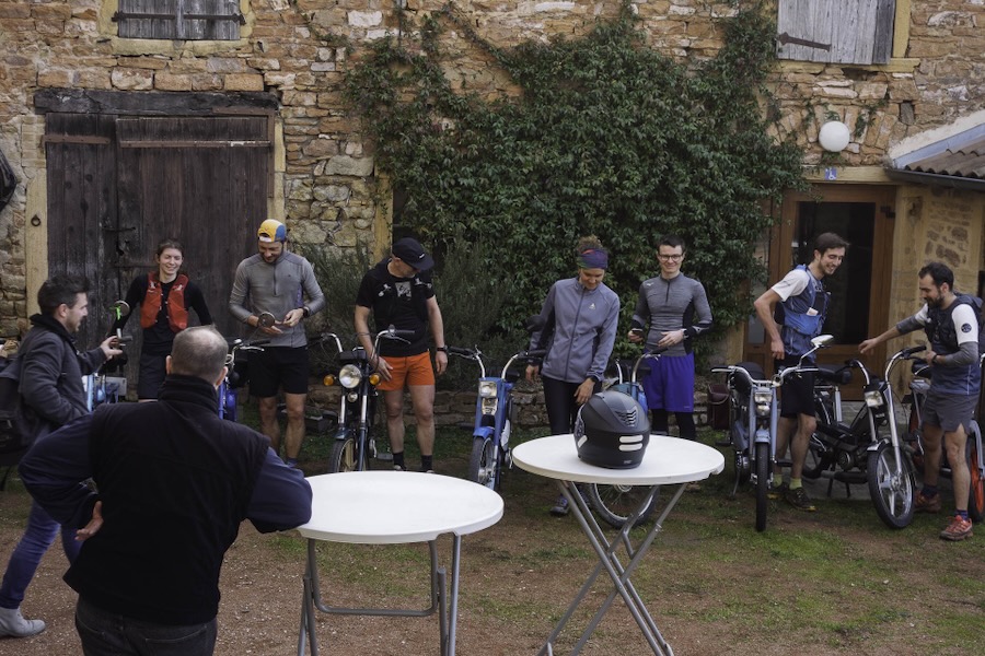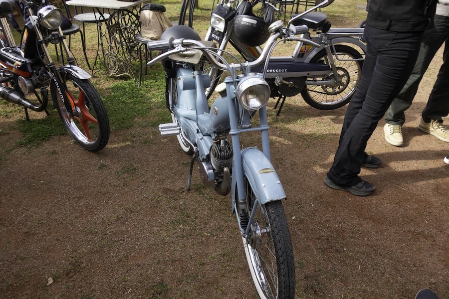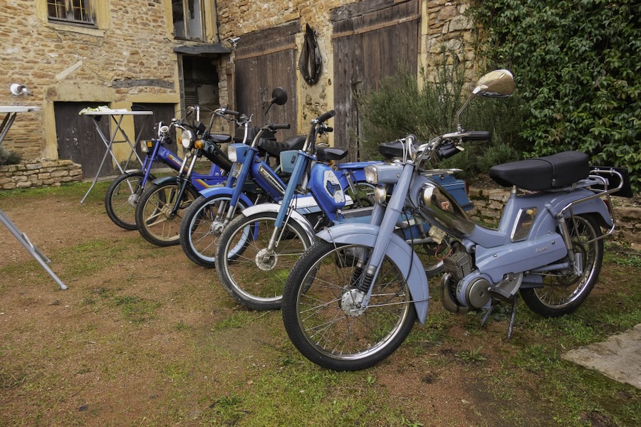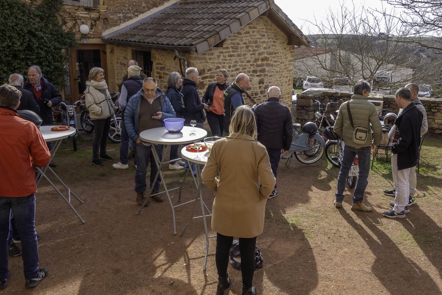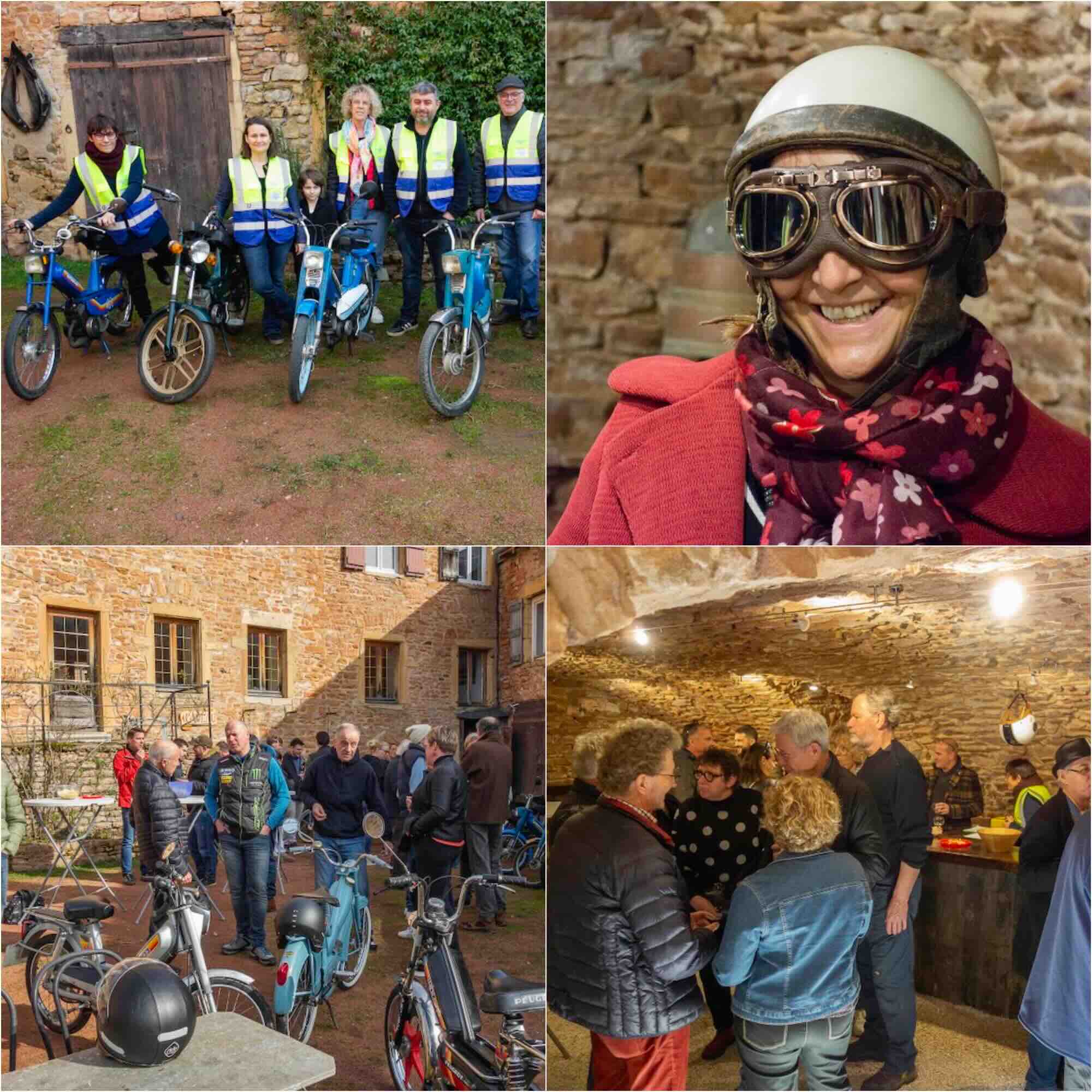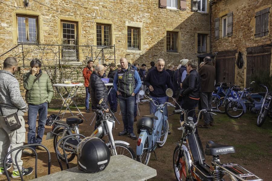 Dès 9h30 dimanche, c’était l’inauguration du club. L’équipe fondatrice recevait les personnes intéressées. Les cyclomoteurs alignés comme à la parade, dans la cour du caveau de Leynes indiquaient aux arrivants qu’ils étaient, sans nul doute, au bon endroit, et le brouhaha des conversations provenant de la cave leur indiquait sans erreur possible, le chemin à suivre.
