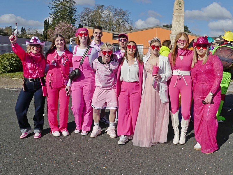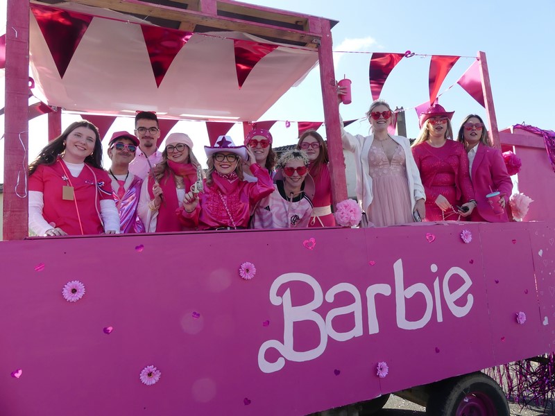 10 jeunes de 20 ans déguisé.es en Barbie ont pris place sur leur char rose Barbie.