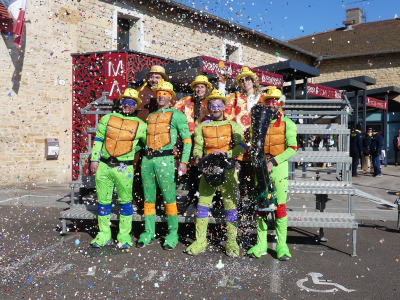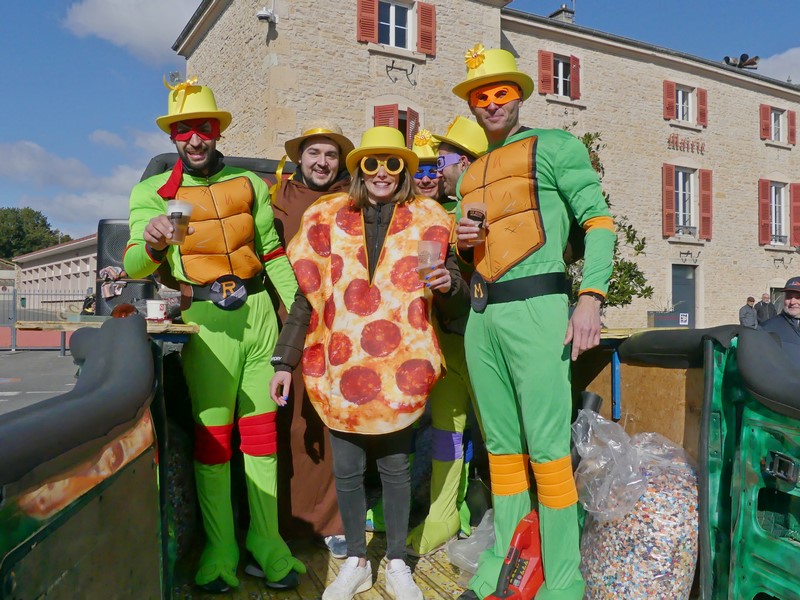 7 trentenaires costumés en Tortue Ninja prenaient place sur leur char.