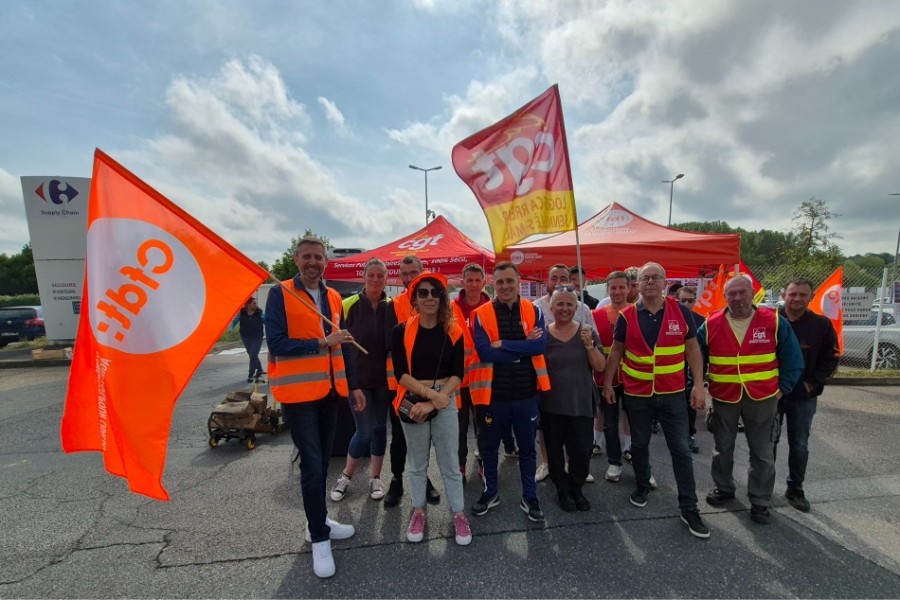 Ce mercredi matin, une trentaine de membres de la CFDT et de la CGT Carrefour supply chain se sont réunis dans le cadre d'une grève dénonçant des hausses de salaires estimées "dérisoires" pour les différents salariés : pour les travailleurs ayant moins de 15 ans d'ancienneté (1,1% de hausse) et pour les travailleurs ayant plus de 15 ans d'ancienneté (1,3% de hausse).