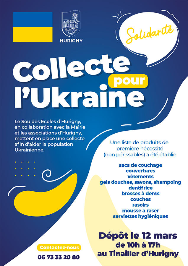Le Sou des Écoles d’Hurigny, avec l’aide de la commune et les associations d'Hurigny, organisent une collecte de produits de première nécessité pour venir en aide au peuple Ukrainien. Les dépôts seront possibles samedi prochain, 12 mars, de 10h à 17h au Tinaillet d'Hurigny.