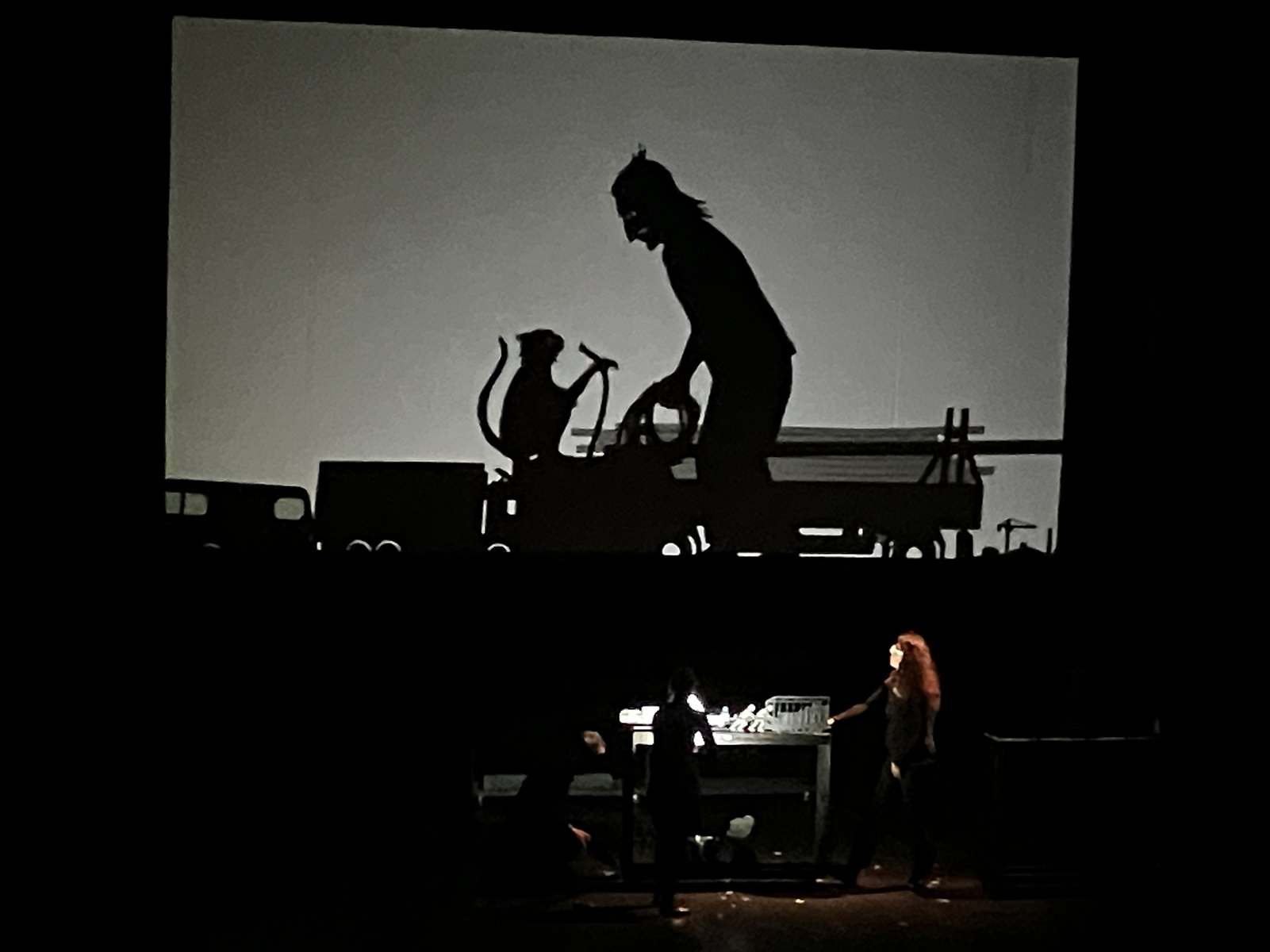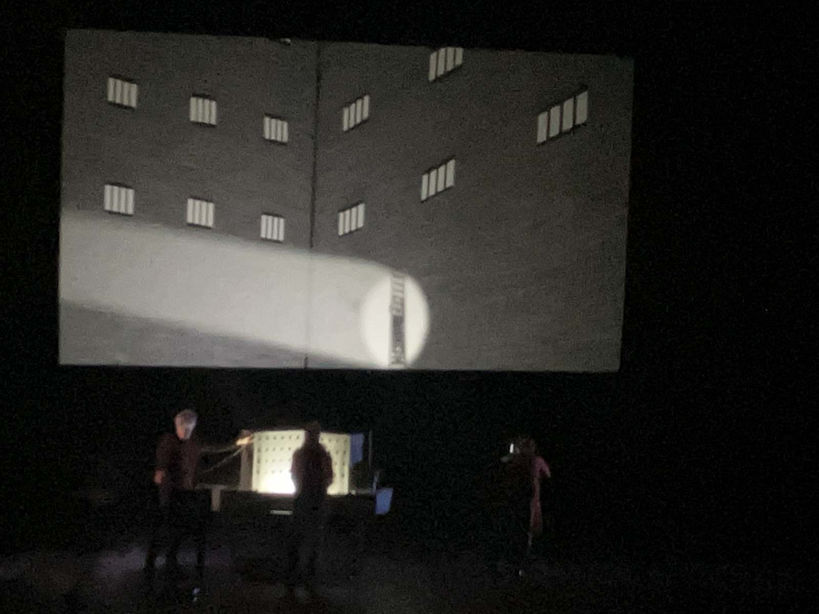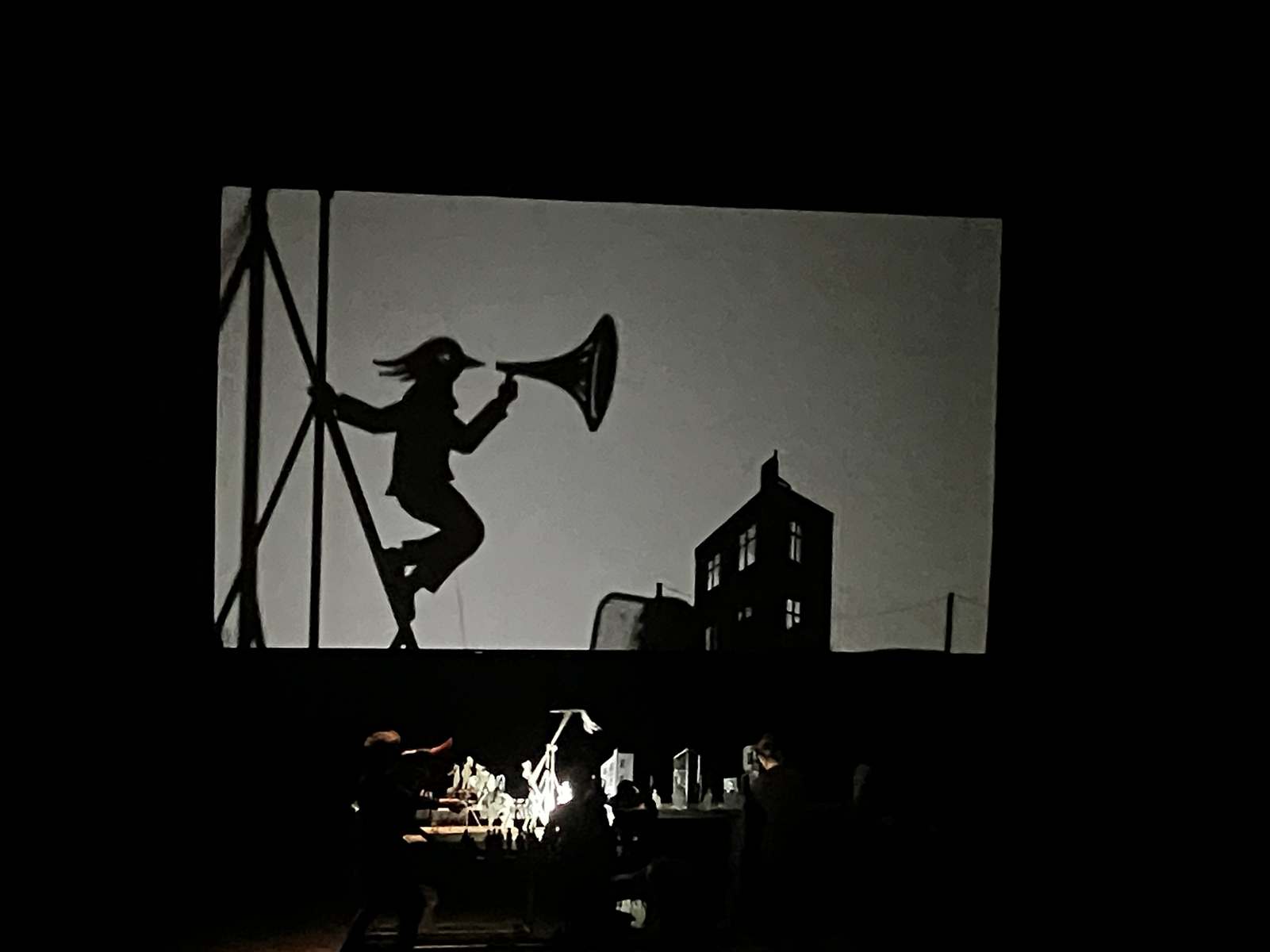 La salle est plongée dans la pénombre et le silence, introduisant l’ambiance sombre à venir. On peut saluer les musiciens jouant en direct sur scène pour la difficulté qui leur est ajoutée avec l’obscurité. Tandis que le public entrevoit les miniatures des décors et des personnages à l’avant de l’écran, ceux-ci sont projetés sur la toile, mettant en lumière le travail des artistes. Pas de paroles, celle-ci sont des imitations produite de façon originale avec les instrument à vent. Les décors glissant sur la scène au fil du spectacle, la rapidité et la dextérité des artistes est évidente. Tandis que la musique est légère au début, accompagné de bruitages, comme par exemple des sirènes brillamment reproduites par les musiciens, elle s’intensifie au cours de la représentation. Les musiciens finissent d’ailleurs par rejoindre la scène à l’avant de l’écran. Les sons sont tantôt amplifiés et coupés brutalement entre chaque scène. L’ambiance oscille entre l’humour et la festivité des spectacles et celle plus sombre de l’emprisonnement.