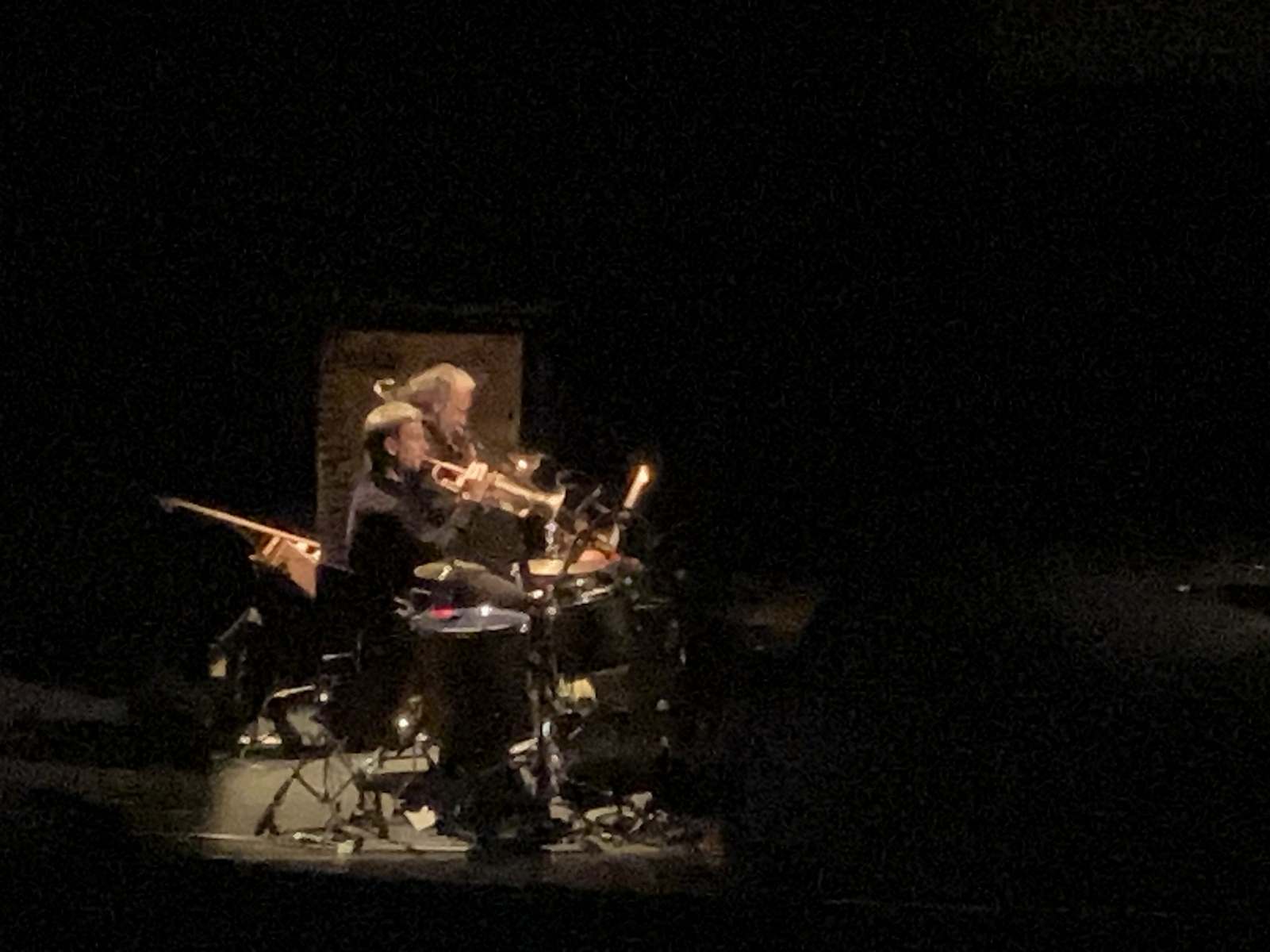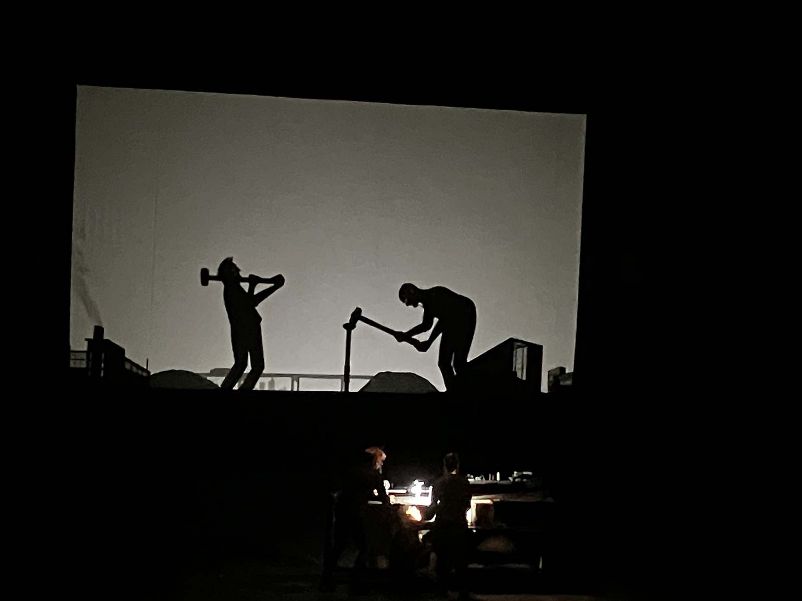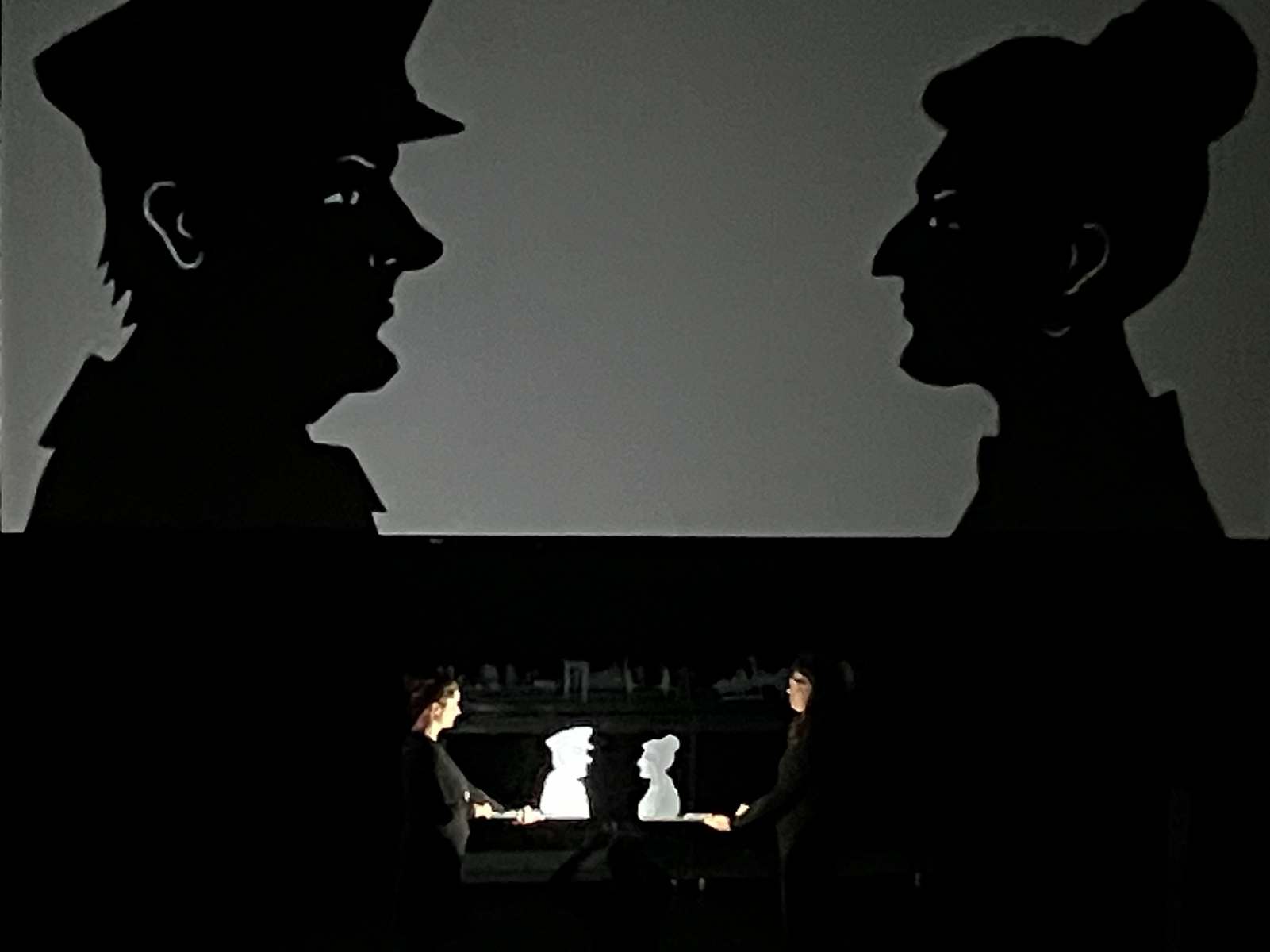 La salle est plongée dans la pénombre et le silence, introduisant l’ambiance sombre à venir. On peut saluer les musiciens jouant en direct sur scène pour la difficulté qui leur est ajoutée avec l’obscurité. Tandis que le public entrevoit les miniatures des décors et des personnages à l’avant de l’écran, ceux-ci sont projetés sur la toile, mettant en lumière le travail des artistes. Pas de paroles, celle-ci sont des imitations produite de façon originale avec les instrument à vent. Les décors glissant sur la scène au fil du spectacle, la rapidité et la dextérité des artistes est évidente. Tandis que la musique est légère au début, accompagné de bruitages, comme par exemple des sirènes brillamment reproduites par les musiciens, elle s’intensifie au cours de la représentation. Les musiciens finissent d’ailleurs par rejoindre la scène à l’avant de l’écran. Les sons sont tantôt amplifiés et coupés brutalement entre chaque scène. L’ambiance oscille entre l’humour et la festivité des spectacles et celle plus sombre de l’emprisonnement.