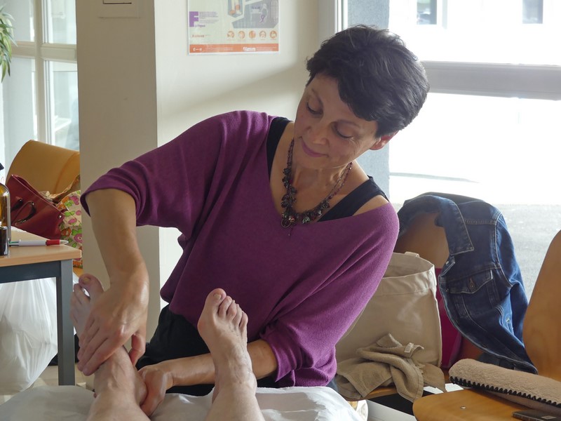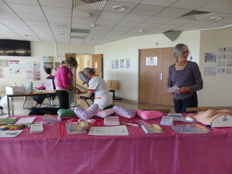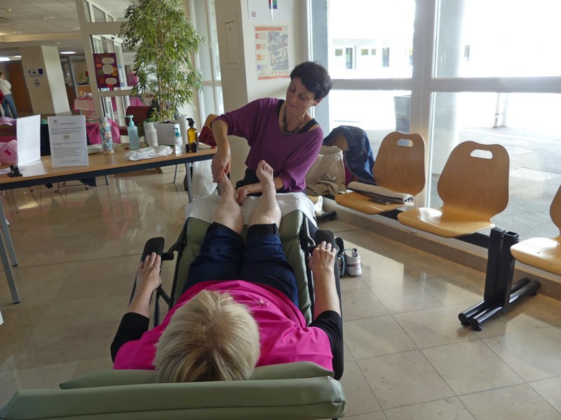 Audrey Bonnetain, réflexologue plantaire est formée pour l'accompagnement en oncologie. Son cabinet est situé à Bussières. Elle intervient dans les entreprises pour des massages Amma assis (ciblant uniquement la partie supérieure du corps) ainsi qu'à la Polyclinique. Elle a prodigué toute l'après-midi de la réflexologie plantaire.