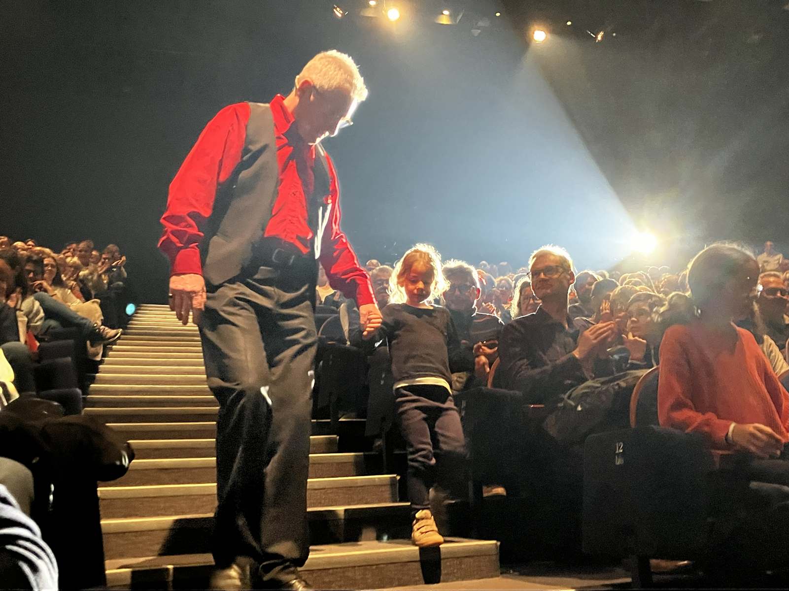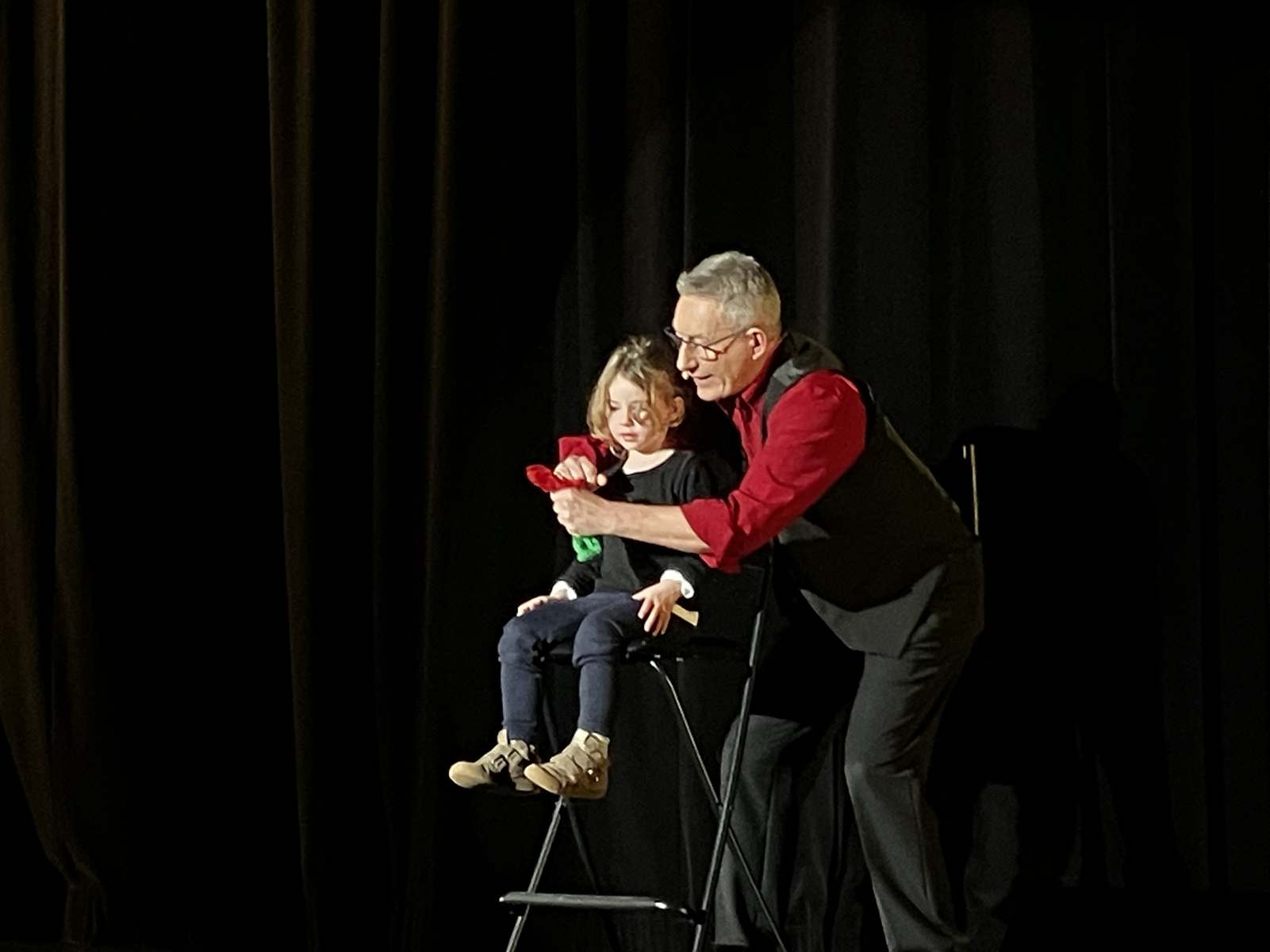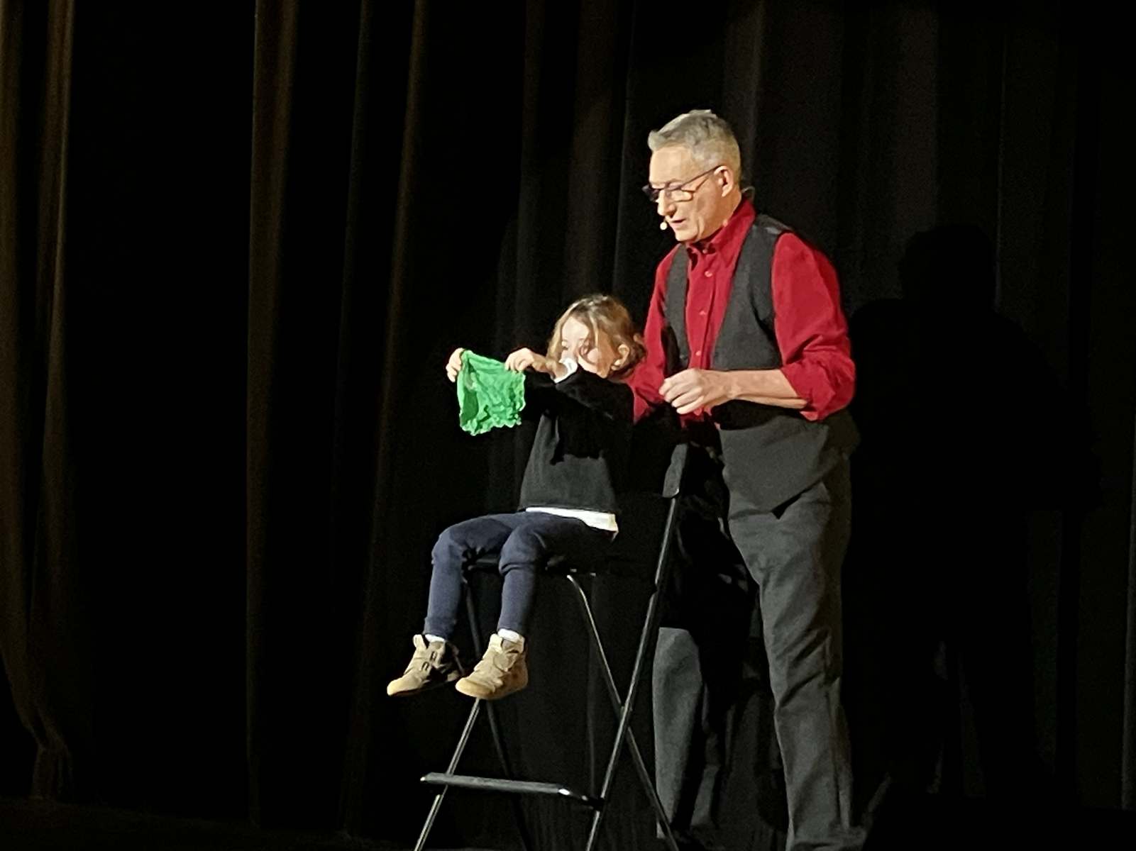Philippe revient ensuite au devant du public pour rire cette fois du sérieux d’une petite fille, tandis que le foulard qu’elle tient change de couleur, apparaît et disparaît devant ses yeux innocents.