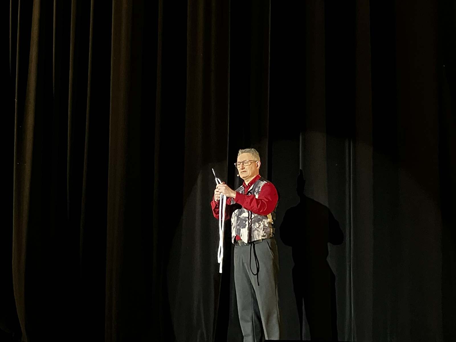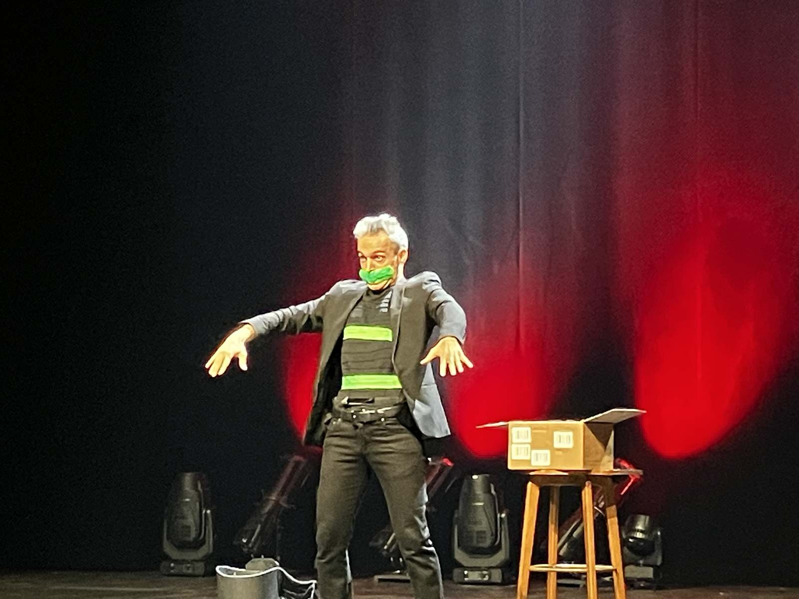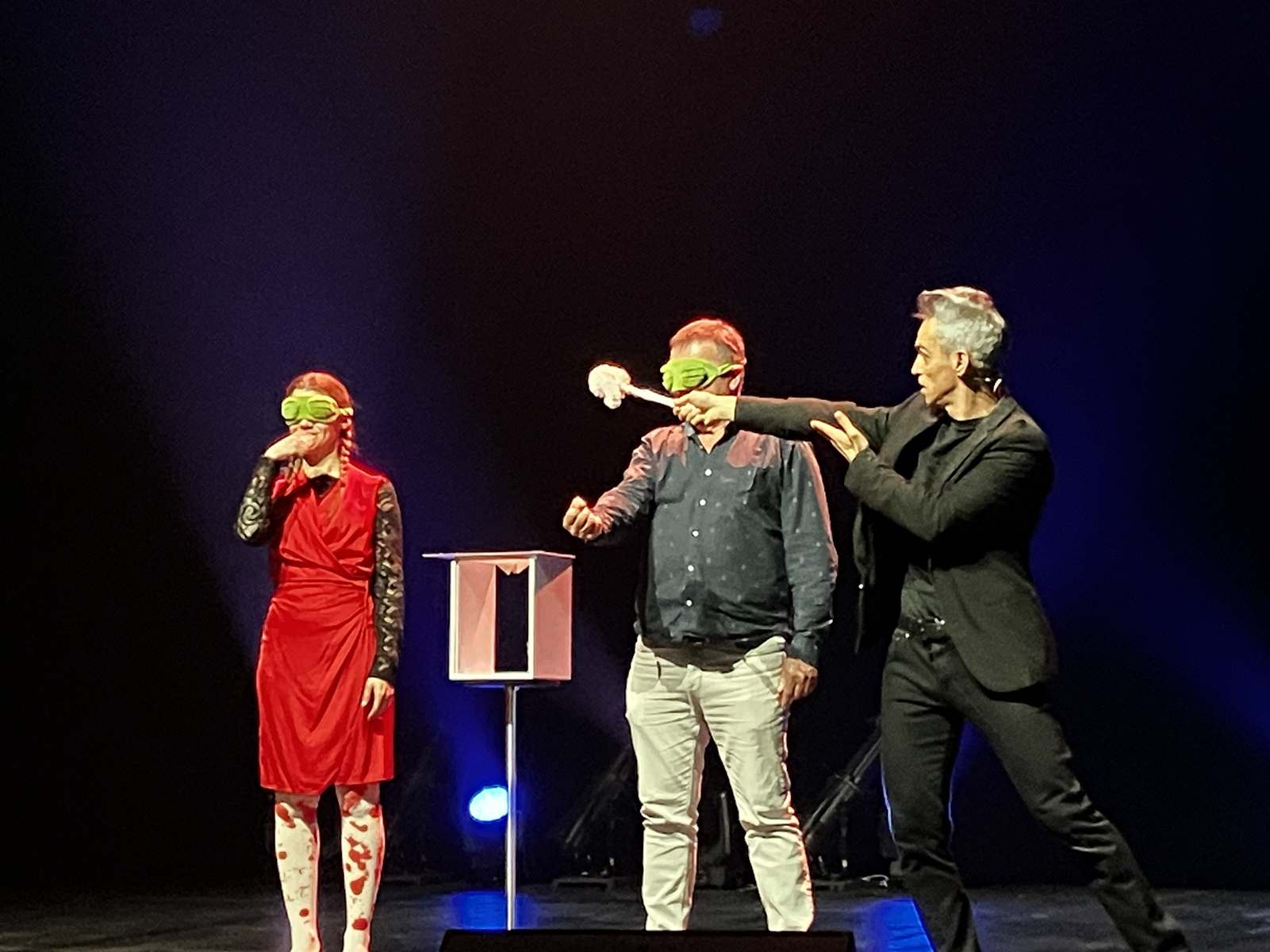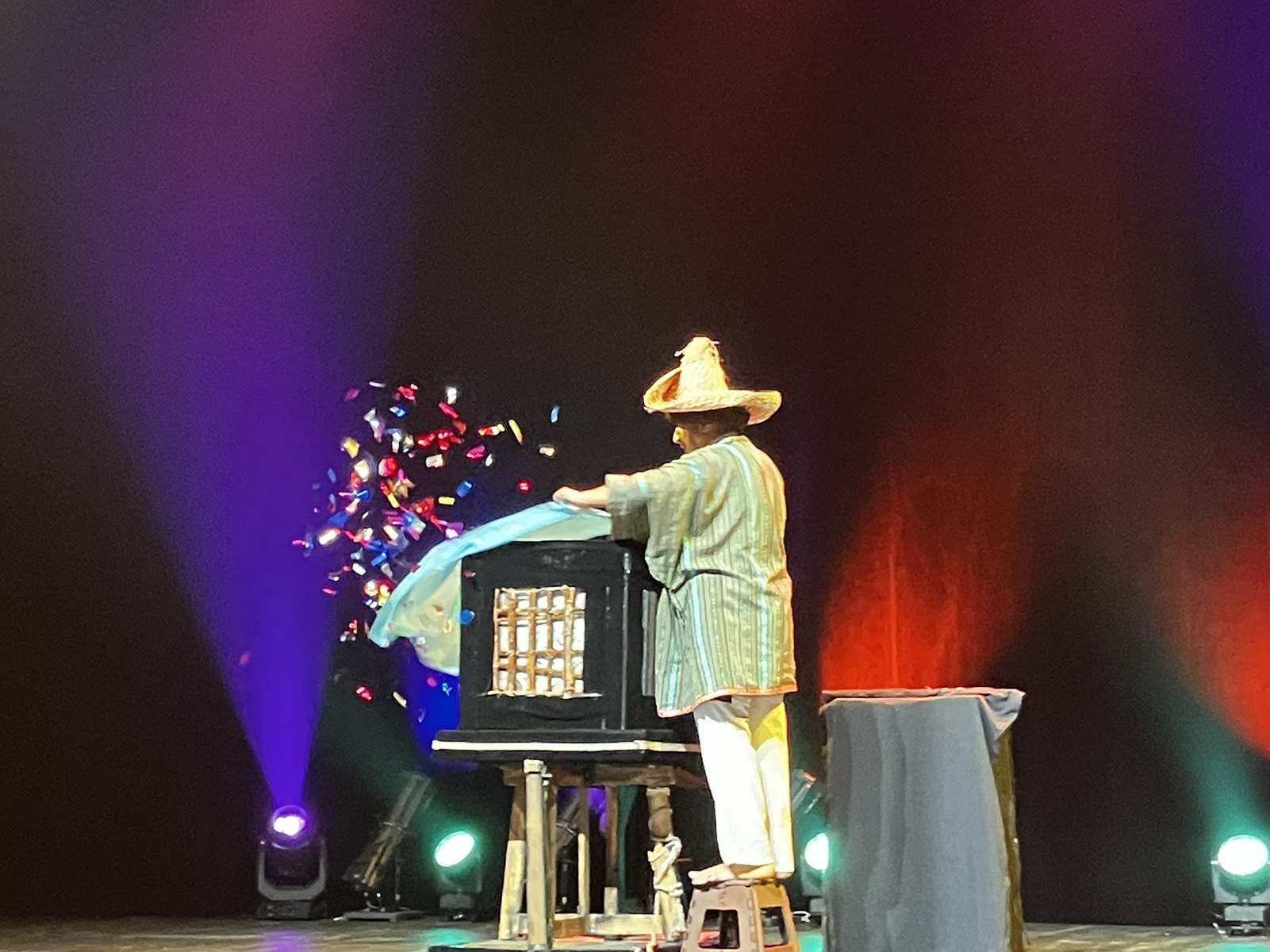 Philippe revient ensuite au devant du public pour rire cette fois du sérieux d’une petite fille, tandis que le foulard qu’elle tient change de couleur, apparaît et disparaît devant ses yeux innocents.