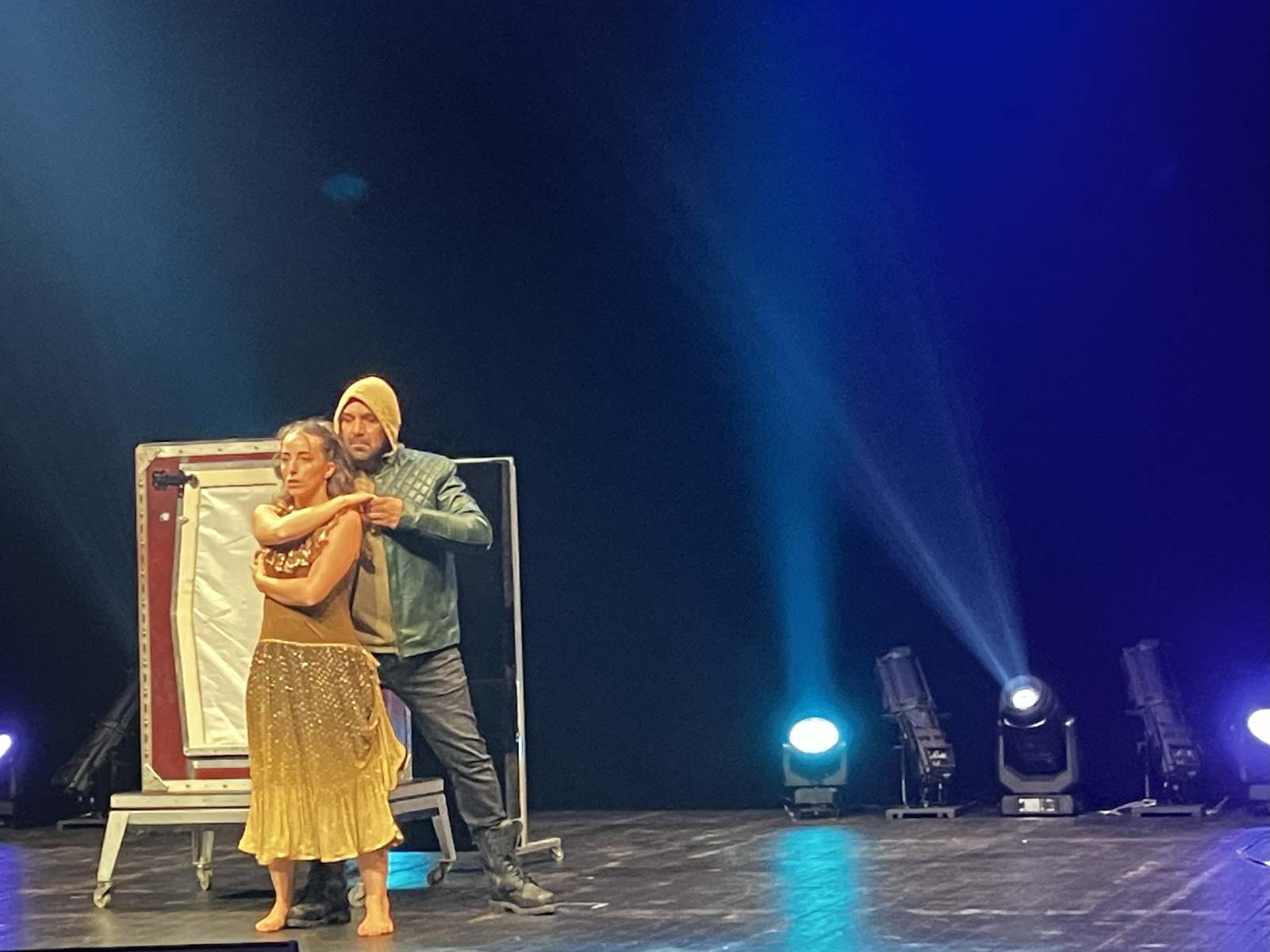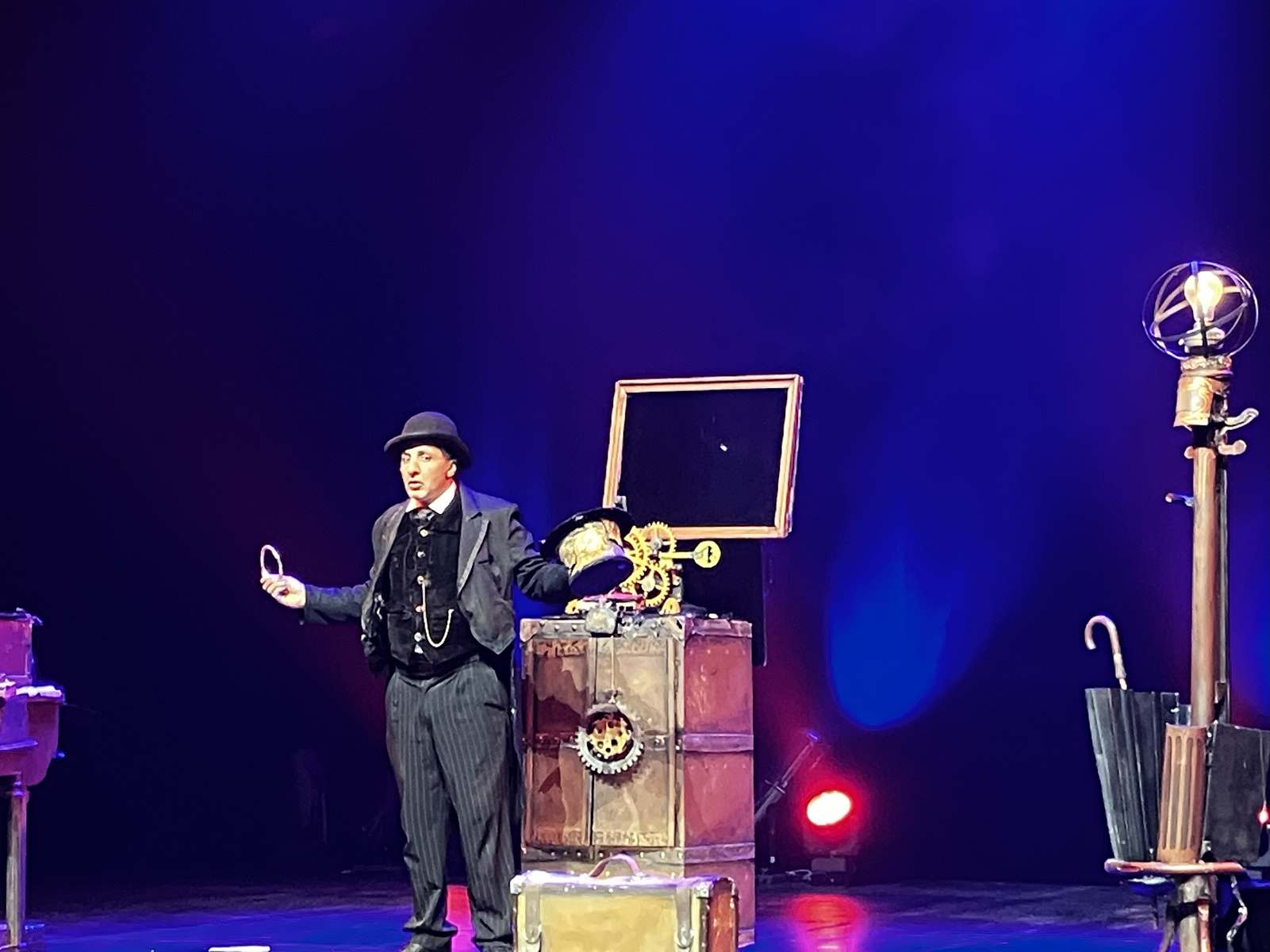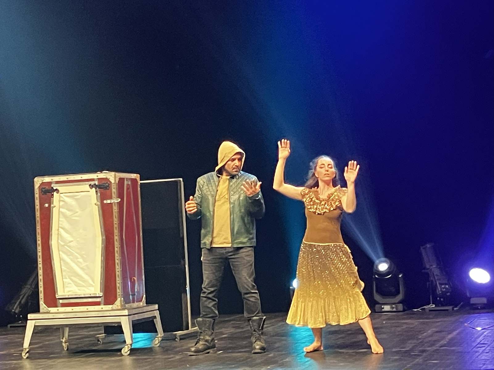 La soirée se poursuit autour du voyage, avec un second numéro de mentalisme de Philippe, mettant en scène le tirage au sort d’un voyage pour un couple de jeunes mariés. C’est ensuite au Mexique que le public est transporté. Les instruments mis en scène changent de forme, opposant les cultures et l’ambiance de l’un à l’autre, notamment à travers la musique. Tout apparaît dans une boîte aux dimensions improbables pour contenir tout cela.