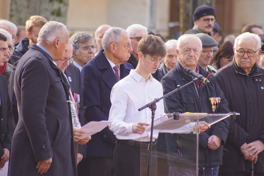 Après cela, lectures ont été faites du message de l’Union française des associations de combattants et victimes de guerre par le jeune Théo Boissard, adhérent du Souvenir français, de l’ordre du jour du maréchal Foch par la jeune Alienor Coutal, collégienne en classe défense au collège Schuman.