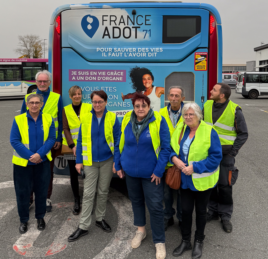 Ludovic Brochand, le responsable d’atelier de Transdev, qui représentait la société de transport, pour des raisons de sécurité sur le vaste parking emprunté par les bus, avait souhaité que les gilets jaunes de sécurité, soient de mise. Pour France ADOT 71 cet événement, est le symbole d’un partenariat inédit entre le transporteur public et l’association départementale de sensibilisation au don d’organes et de tissus. Une cause toujours urgente : 25 000 personnes en attente de greffe en 2024. France ADOT 71 œuvre depuis de nombreuses années sur tout le département pour informer, expliquer et inciter au dialogue autour du don d’organes, de tissus et de moelle osseuse. L’association intervient dans les collèges, lycées, entreprises, communes, mutuelles … et lors de nombreux événements pour « faire passer le message de la vie ».