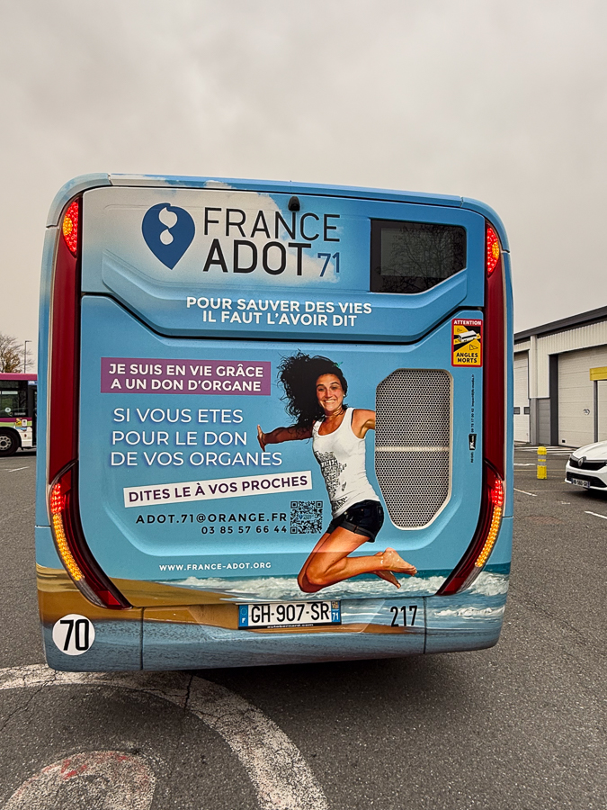 L’association France ADOT 71 et Transdev ont officialisé jeudi dernier une opération inédite de sensibilisation au don d’organes : le covering ''du cul d’un bus'' de la flotte mâconnaise. Cette initiative, rendue possible grâce à la société JFK Média, vise à toucher quotidiennement les habitants de Mâcon et de ses environs par un message fort : « Parlez du don d’organes avec vos proches ».