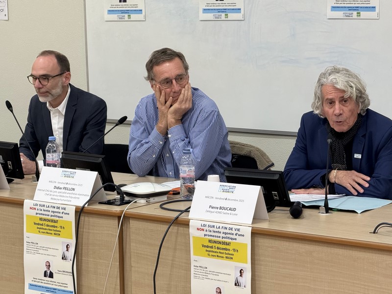 Ce vendredi 5 décembre, c’est devant près de 50 personnes réunies en l'amphithéâtre Guillemin, que Jacques Boucaud, Délégué départemental 71 de l’ Association pour le Droit de Mourir dans la Dignité (l’ADMD), accompagné de Yoann Brossard secrétaire général de l’ADMD, accueillait le docteur Didier Peillon, auteur de « Ces malades que nous aidons à mourir ».