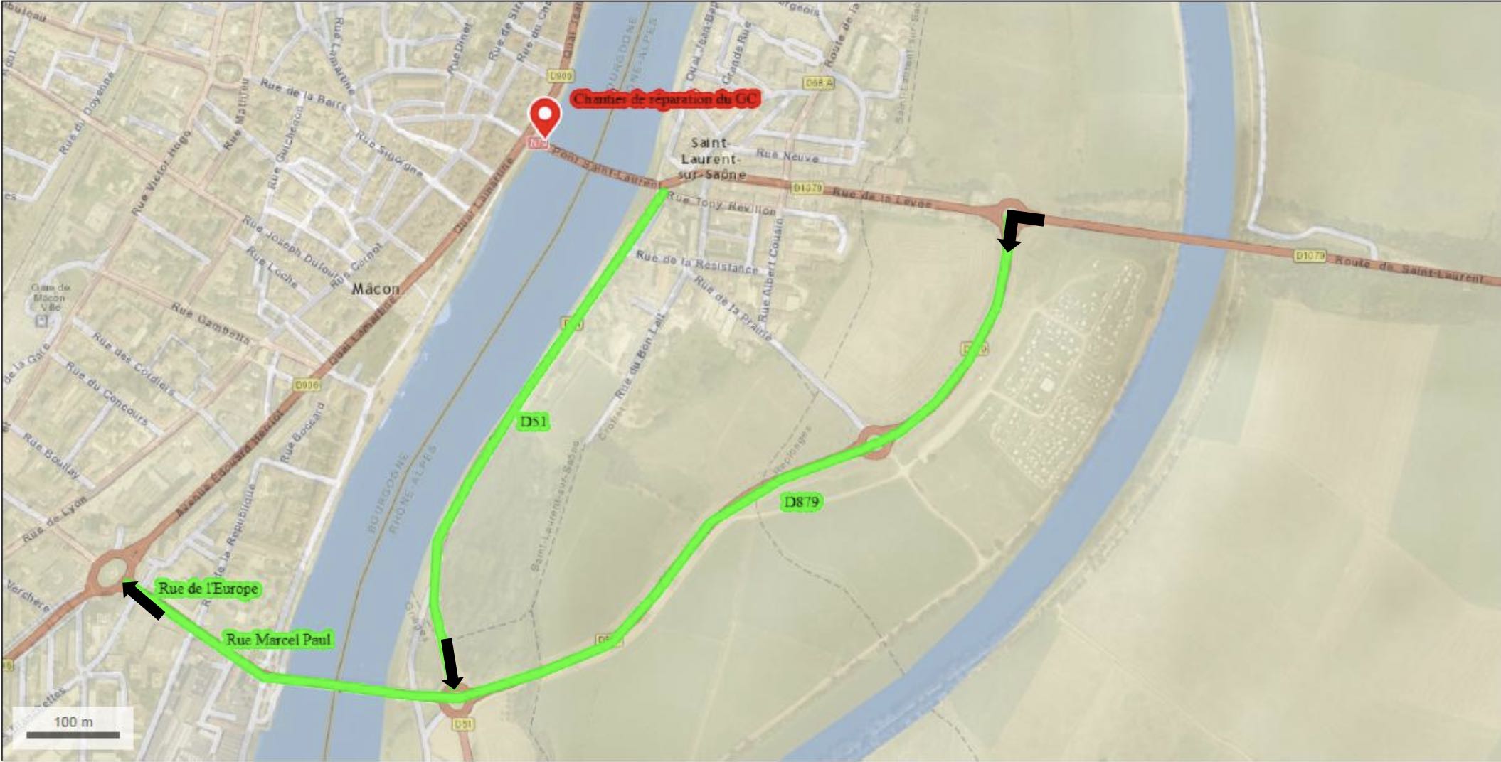 Une déviation pour tous les véhicules (véhicules légers et poids lourds) sera mise en place dans le sens Replonges – Mâcon :