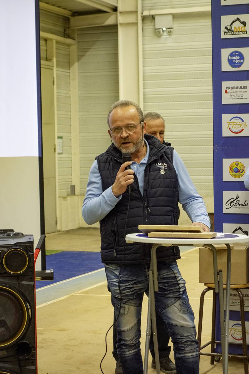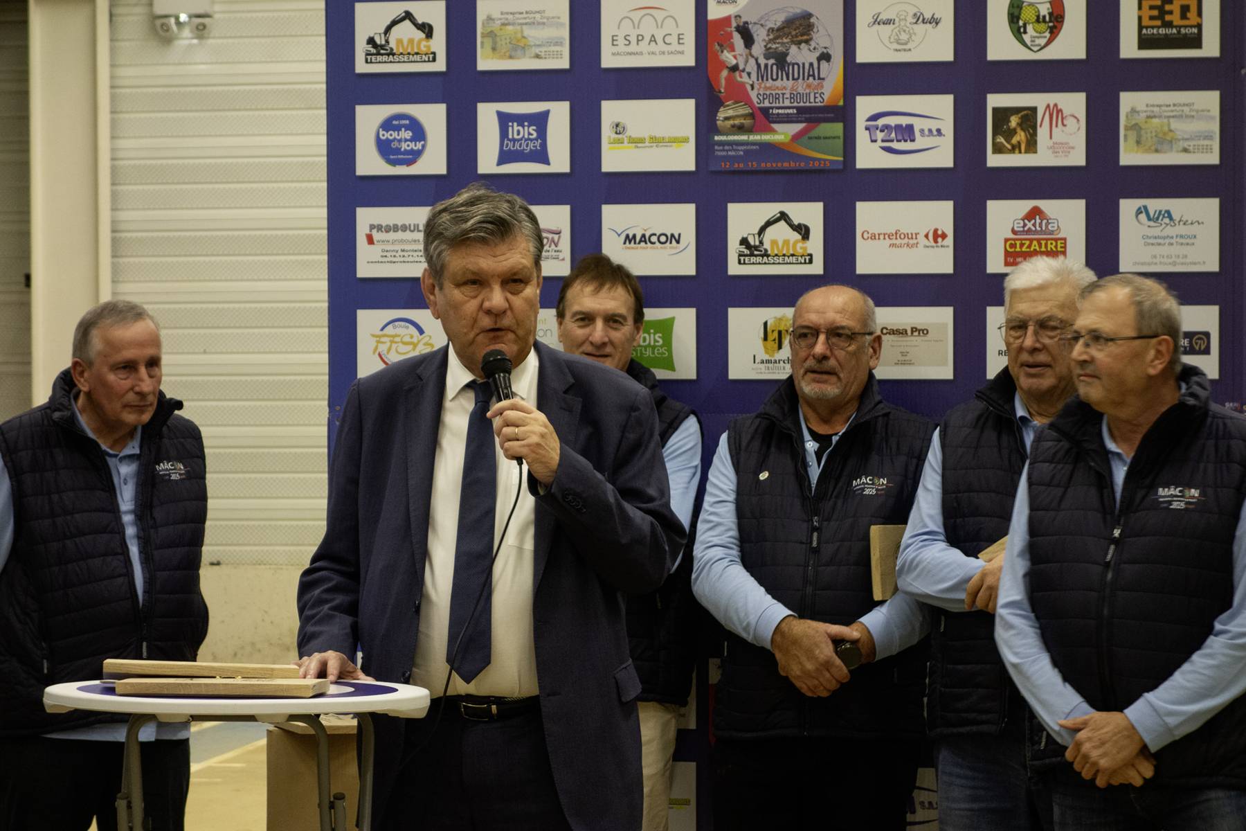 « Vous voyez ce soir un Maire heureux, ces championnats du monde se sont excellemment bien déroulés. Toutes les délégations et le public ont été subjugués par l’organisation et les installations. J’ai particulièrement durant ces quelques jours, d’être le Maire de la ville de Mâcon. Tout comme Philippe Troncy, je félicite également la Pétanque Mâconnaise, qui a spontanément accepté de suspendre ses activités pour permettre le déroulement de ces championnats. Je remercie également l’ensemble des bénévoles, car sans les associations rien ne se ferait. En tant qu’ancien bouliste, ça fait du bien de démontrer que, contrairement à certains dires, le sport boule se porte bien et a encore un bel avenir. À Mâcon nos bénéficions surtout, de très belles installations, ceci grâce à notre député Benjamin Dirx, qui a su décrocher les subventions nécessaires. Tout ceci a permis, durant ces trois jours, de porter haut le nom de la ville de Mâcon avec des retombées économiques non négligeables. »