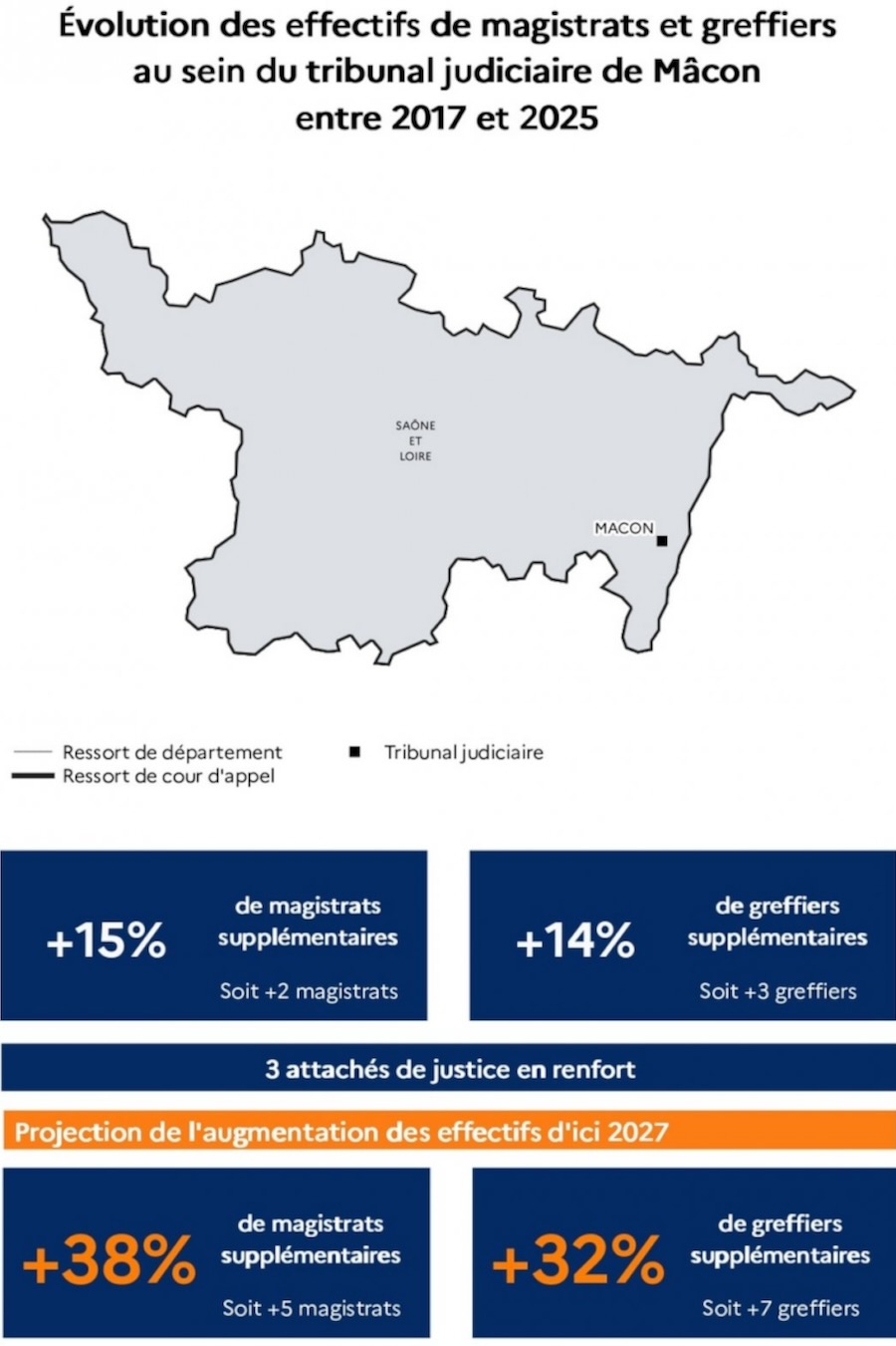 La loi d’orientation et de programmation 2023-2027 du ministère de la Justice prévoit le recrutement en France de 1 500 magistrats, 1 800 greffiers et 1 100 attachés de justice sur la période 2023-2027. Les augmentations d'effectifs atteindront +38 % de magistrats et +32 % de greffiers au tribunal judiciaire de Mâcon annonce le ministère de la Justice.