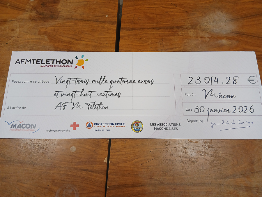 Ce vendredi soir, à la caserne des pompiers de Mâcon, se tenait la cérémonie de remise officielle du chèque des dons récoltés au cours du téléthon 2025. De nombreuses personnes étaient présentes pour écouter les différents discours. À commencer par celui de Philippe Denis, coordinateur AFM Est Saône et Loire : " Merci à tous les bénévoles et membres des associations impliqués : 30 associations et commerçants se sont mobilisés (soit 10 de plus qu’en 2024). Merci à tous les généreux donateurs qui ont contribué à la réussite totale de ce Téléthon 2025. Merci au nom de l’AFM, au nom des malades, des chercheurs et au nom des familles de malades. " Il rappelle qu’au soir de ce 6 décembre le compteur affichait 83 504 259 €. Grâce à la mobilisation de 280 000 bénévoles, 22 000 animations en France et à l’étranger. Les recettes ont été intégralement renversées à l’AFM pour servir 2 objectifs fondamentaux : guérir et aider les malades.