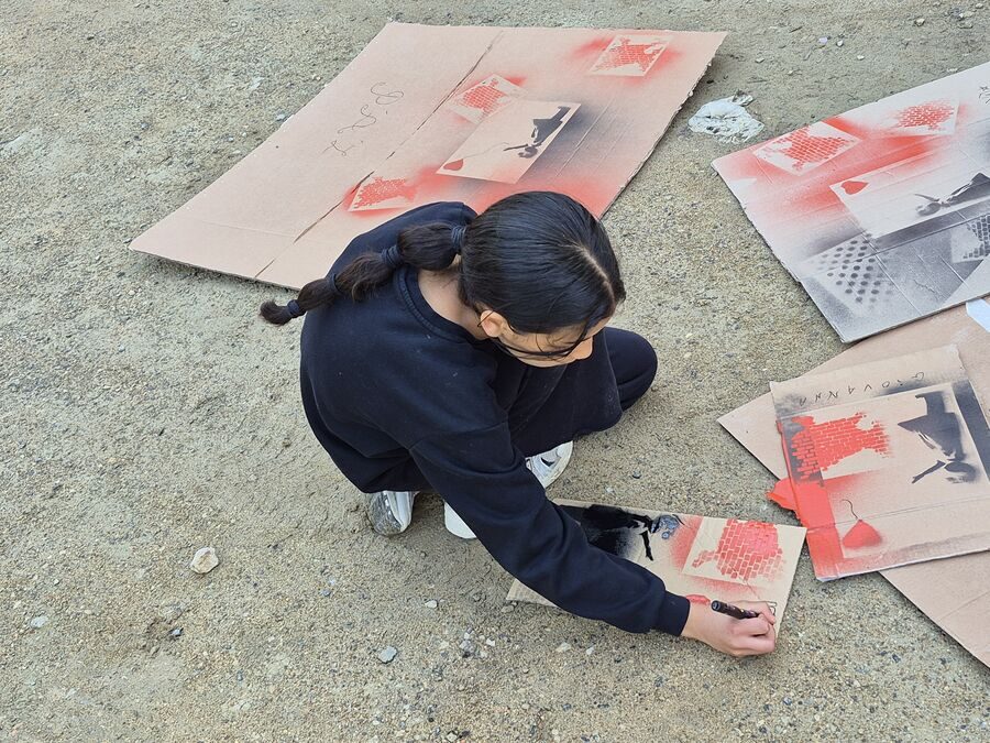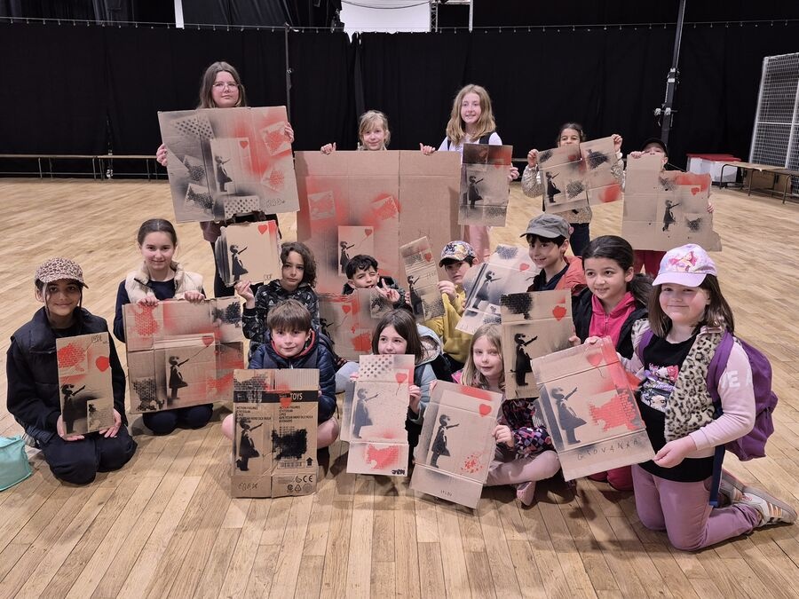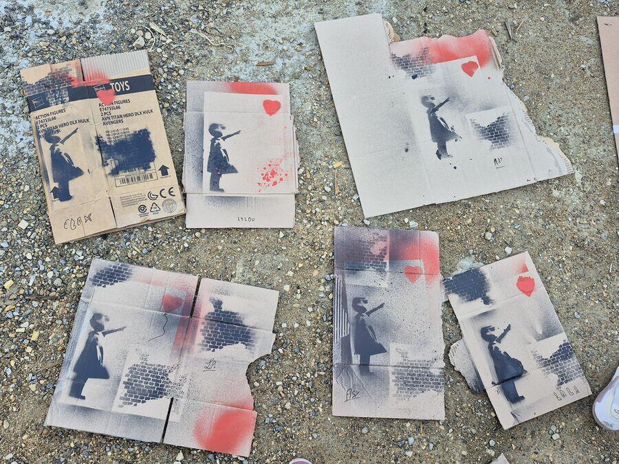 En ce troisième jour du stage "Faire le mur", dix-huit enfants, originaires de Mâcon, se sont essayés à la technique du pochoir, représentant une petite fille au cerf-volant en forme de cœur (inspirée de l’œuvre "Girl with Balloon" de Banksy). Chaque enfant réalisait son travail sur un bout de carton découpé, de la taille qu'il souhaitait. Parenthèse : les bombes de peinture vides seront ensuite personnalisées par les enfants pour garder un souvenir intacte de cette semaine à la MJC. Les cartons, quant à eux, seront recyclés.