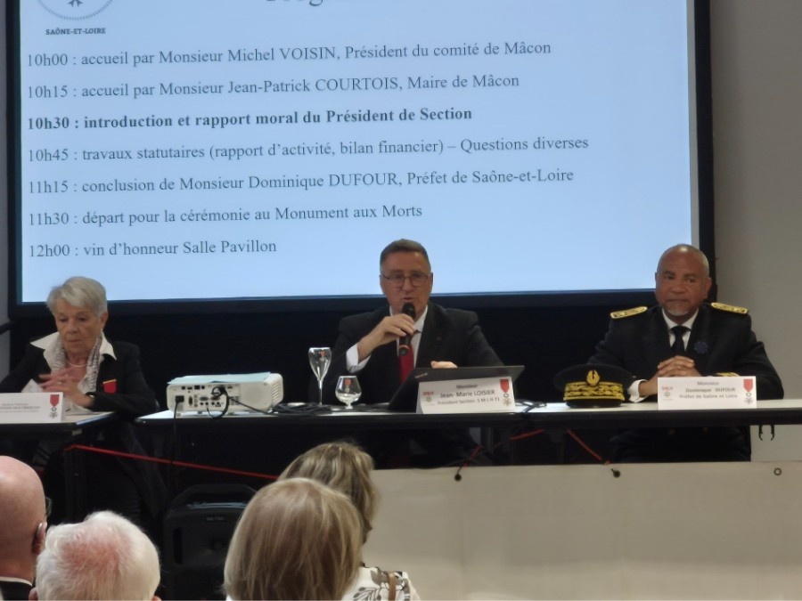L'assemblée a débuté par les traditionnels remerciements aux différentes personnalités présentes, notamment Monsieur Dominique Dufour, préfet de Saône-et-Loire, Monsieur le Colonel Ronan Cottin, délégué militaire départemental ou encore Madame Joëlle Arnould, présidente de l'Ordre national du Mérite de Saône-et-Loire. Monsieur Loisier a également tenu à remercier chaleureusement le bureau du comité de Mâcon : Michel Voisin (député honoraire et président du comité), Amédée Lathoud (vice-président), Christiane Berthod-Maitrejean (trésorière), Catherine Pointurier (trésorière adjointe) et Hélène Réty (secrétaire du comité).