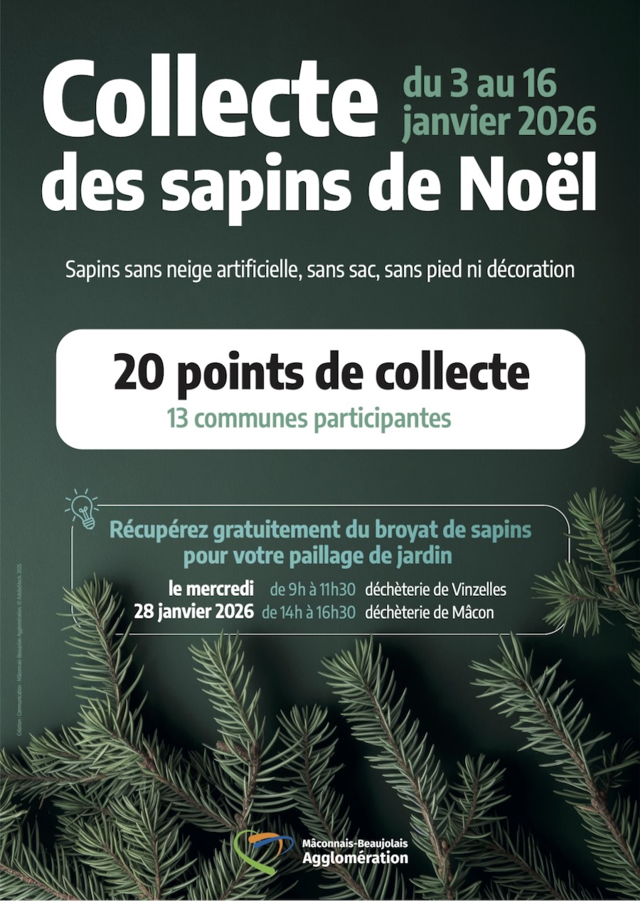 Depuis plusieurs années, Mâconnais-Beaujolais Agglomération organise, en partenariat avec la Ville de Mâcon et Mâcon-Habitat, une opération de broyage des sapins de Noël tout au long du mois de janvier. Cette initiative, désormais étendue aux communes volontaires de l’Agglomération, vise à valoriser ces déchets végétaux et à promouvoir l’usage du broyat dans les jardins et espaces verts.