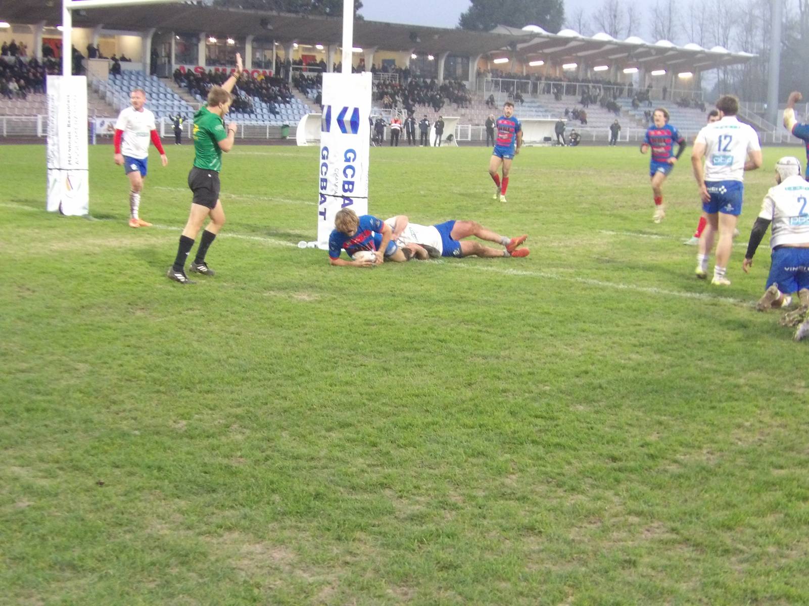Mâcon poussait dans les 22 mètres adverses et suite à une nouvelle mêlée, le capitaine des Rouge et Bleus aplatissait le ballon en terre promise. Cela portait le score à 17-10 car la transformation était manquée.