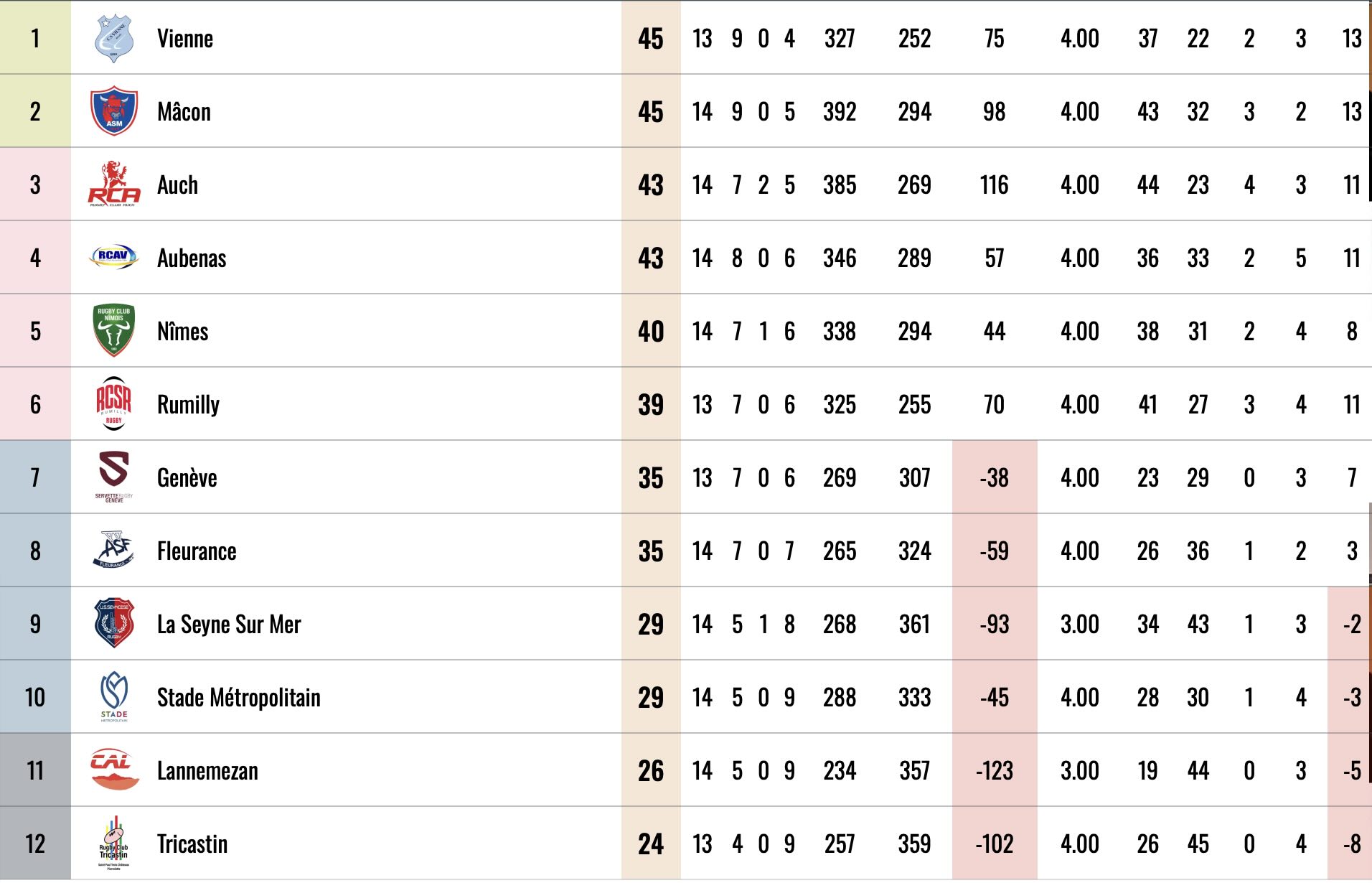 Grâce à cette 9ème victoire de la saison, les mâconnais effectuent une très belle opération en revenant à la hauteur de Vienne, qui compte un match de moins, en tête de la poule 2 de Nationale 2, avec 45 points.