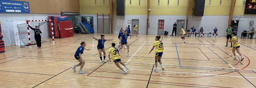 Après la surprenante défaite de la semaine dernière à Arnay-le-Duc (25-16), qui leur fait perdre la tête du championnat, les filles de Sandrine Panier se devaient de réussir face à Marsannay classé en milieu de tableau. Mission réussie d'une fort belle manière. Les Jaunes et bleues sont restées appliquées durent les 60 minutes malgré un premier but des visiteuses, Mâcon fait la course en tête, comptant même un +10 à la 52ème minute grâce à un jet de 7m réussi de Lola Crépaud. Victoire de Mâcon 32-26 (MT 13-8). Avec les victoires de ses concurrents directs, Mâcon conserve sa 3ème place au championnat prénational.