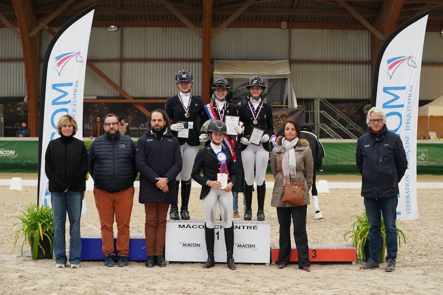 En ce samedi 25 octobre à Mâcon Chaintré, les championnats de France des AS et Amateurs de dressage ont sacré leurs premiers champions. Flavie Barraud et Sir Rubino sont les nouveaux champions de France des AS Minimes. Laure Peretti et Vitalio de la Gesse s'imposent chez les Juniors. Lou Eden Commenge et Legend Dancarino montent sur la plus haute marche du podium Jeunes Cavaliers. Chez les Amateurs 2 et 3 Jeunes, sont respectivement sacrées Thalia Colin et Hortense Smith Huet.
