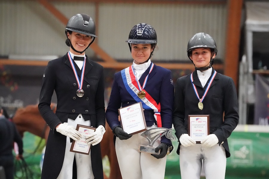 Associée à Zara, la cavalière d'Auvergne-Rhône-Alpes, Louisa de Roussy de Sales, aura dominé ce championnat de France Amateurs 1 de bout en bout. Avec un score total de 208.232 points, elle se voit sacrée Championne de France 2025 de sa catégorie et devance Julie Lequint, médaillée d'argent. Avec Di Magico, la cavalière d'île-de-France a fait un bon classement général depuis le Grand Prix d'hier. Son programme libre noté à un peu plus de 70% lui permet de confirmer son titre de vice-championne de France avec un score total de 201.453 points. Claire Wald et Gauguin Montroyer, venus du Grand Est, repartent avec le bronze.