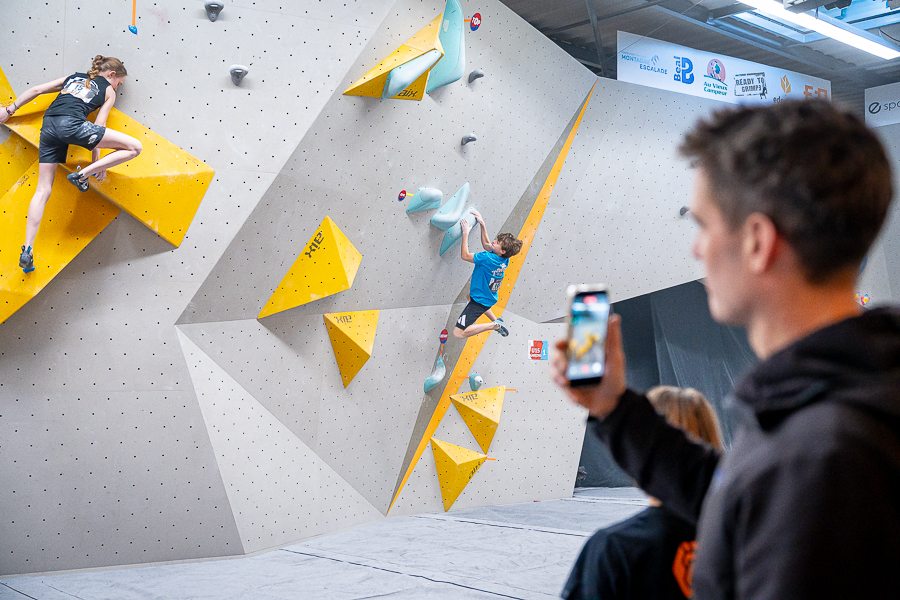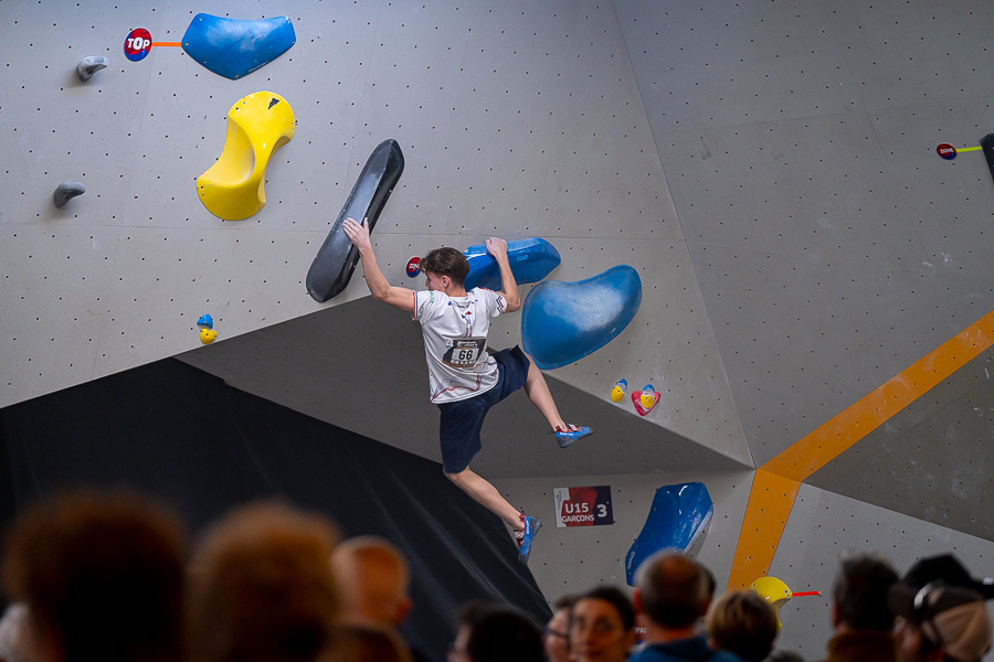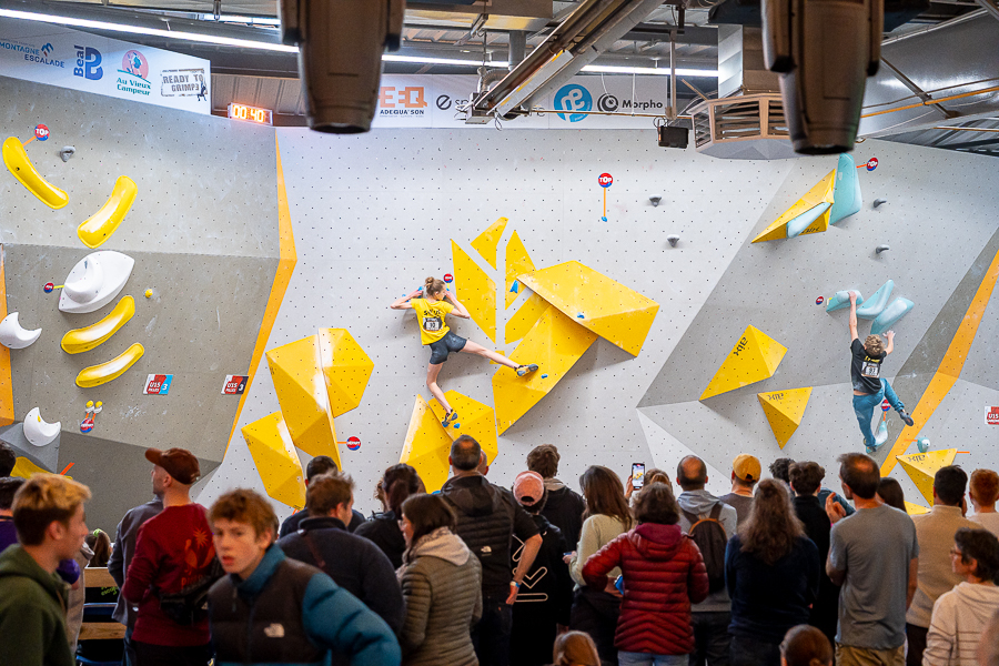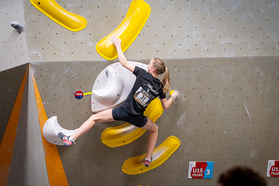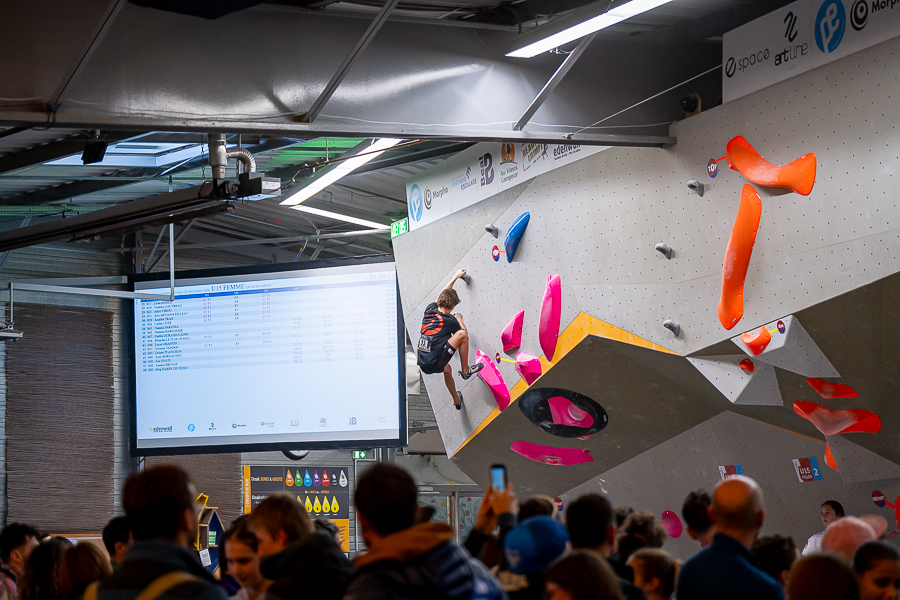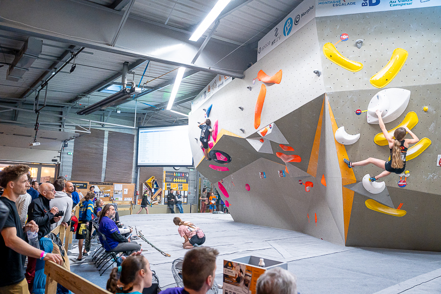 « Il y a environ une cinquantaine de jeunes par catégorie » nous indique Emmanuelle Vallesi, avant de poursuivre « tous les jeunes sélectionnés pour ce championnat de France ce weekend ont déjà passé plusieurs étapes au niveau régional et national. Pour déterminer le champion de France, les jeunes grimpeurs se départagent au cours de qualifications sur 6 blocs. 1 bloc est un parcours d’escalade et chaque participant a 4 minutes pour le lire, le comprendre et enfin essayer de le gravir. Selon la difficulté, il y a des zones intermédiaires à atteindre qui peuvent leur rapporter des points. À l’issue des ces 6 blocs, 8 grimpeurs sont qualifiés pour les finales. Les grandes finales, à partir de 20h ce samedi soir, étaient impressionnantes avec son et lumière, une ambiance de folie et une retransmission en direct sur Youtube ».