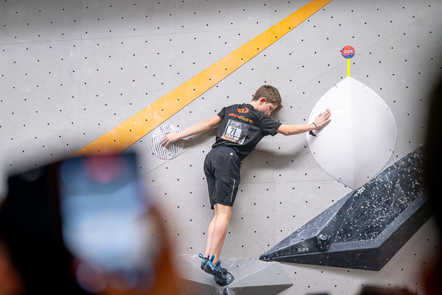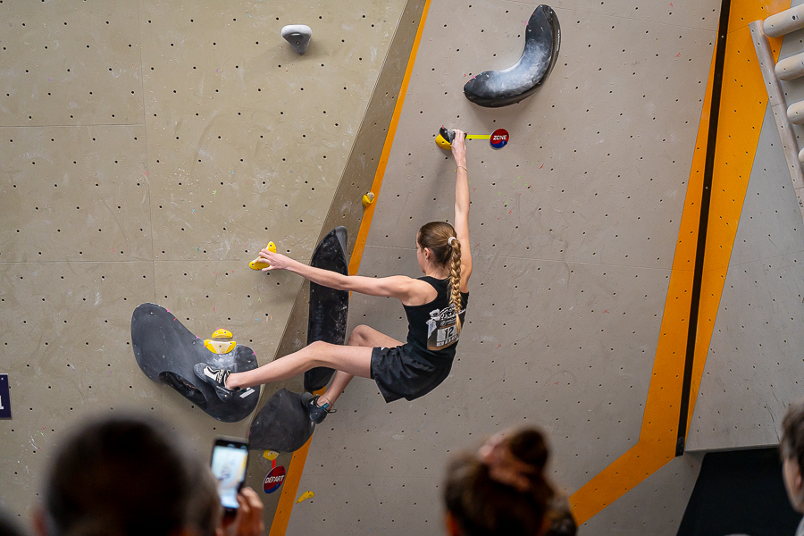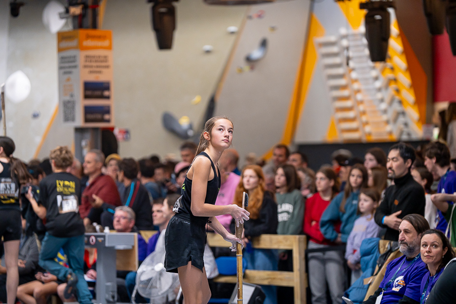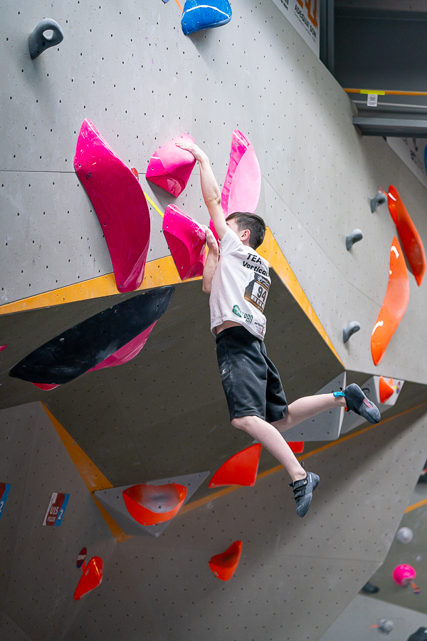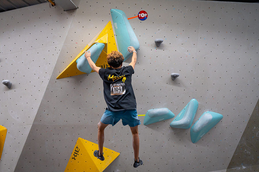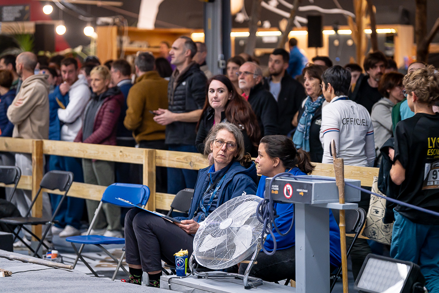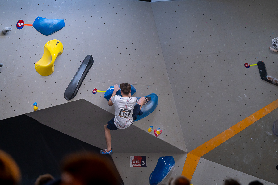 « Il y a environ une cinquantaine de jeunes par catégorie » nous indique Emmanuelle Vallesi, avant de poursuivre « tous les jeunes sélectionnés pour ce championnat de France ce weekend ont déjà passé plusieurs étapes au niveau régional et national. Pour déterminer le champion de France, les jeunes grimpeurs se départagent au cours de qualifications sur 6 blocs. 1 bloc est un parcours d’escalade et chaque participant a 4 minutes pour le lire, le comprendre et enfin essayer de le gravir. Selon la difficulté, il y a des zones intermédiaires à atteindre qui peuvent leur rapporter des points. À l’issue des ces 6 blocs, 8 grimpeurs sont qualifiés pour les finales. Les grandes finales, à partir de 20h ce samedi soir, étaient impressionnantes avec son et lumière, une ambiance de folie et une retransmission en direct sur Youtube ».
