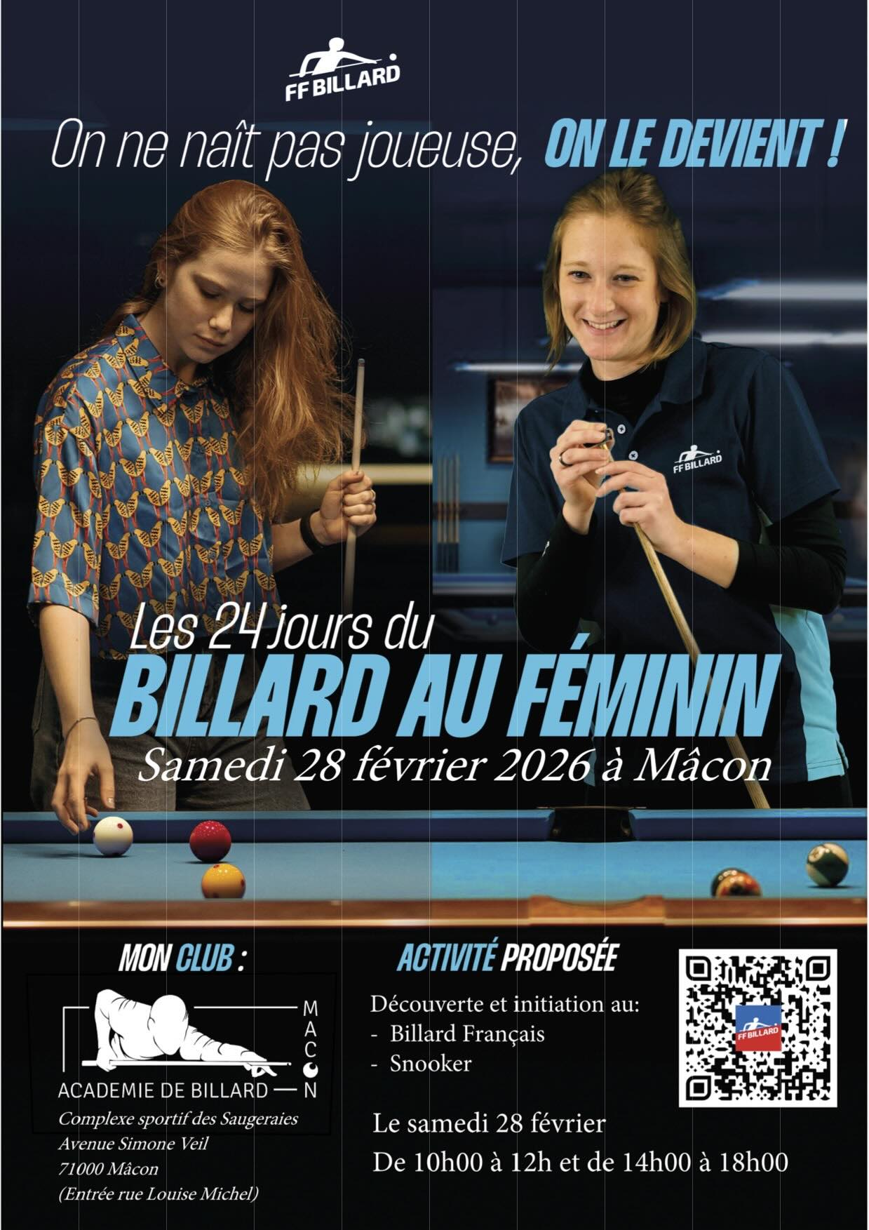 Après les succès de l’édition de 2024 et 2025, l’Académie de Billard de Mâcon s’associe une nouvelle fois à la Fédération française de billard (FFBillard) pour l’opération "Les 24 jours du billard au féminin". Le club propose des événements spécialement pensés pour permettre aux femmes de découvrir et de s’initier au billard dans un cadre accueillant et convivial.
